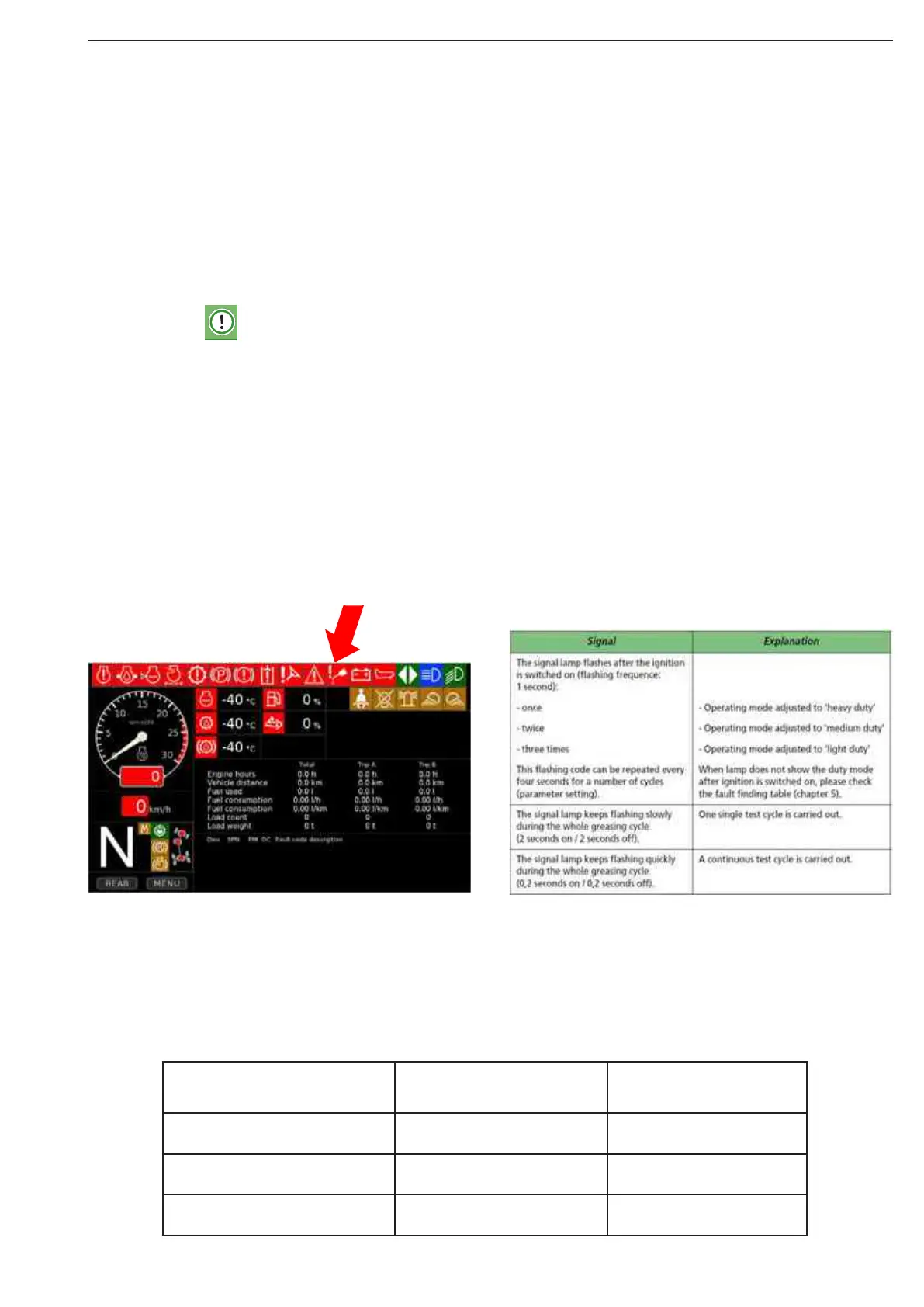 This warning light shows the status of the greasing system and the malfunction reports by means flash codes.