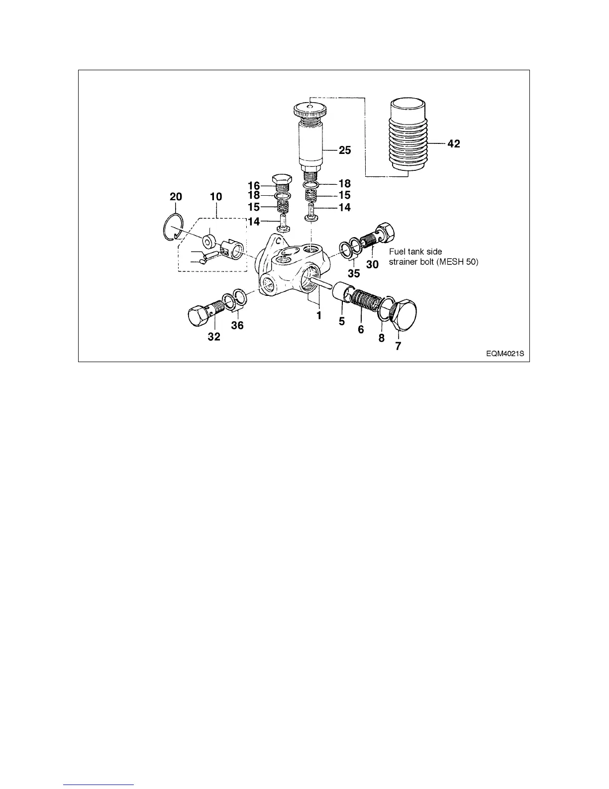 Take off the priming pump (25), plug (16), both gaskets (18), spring (15), and check