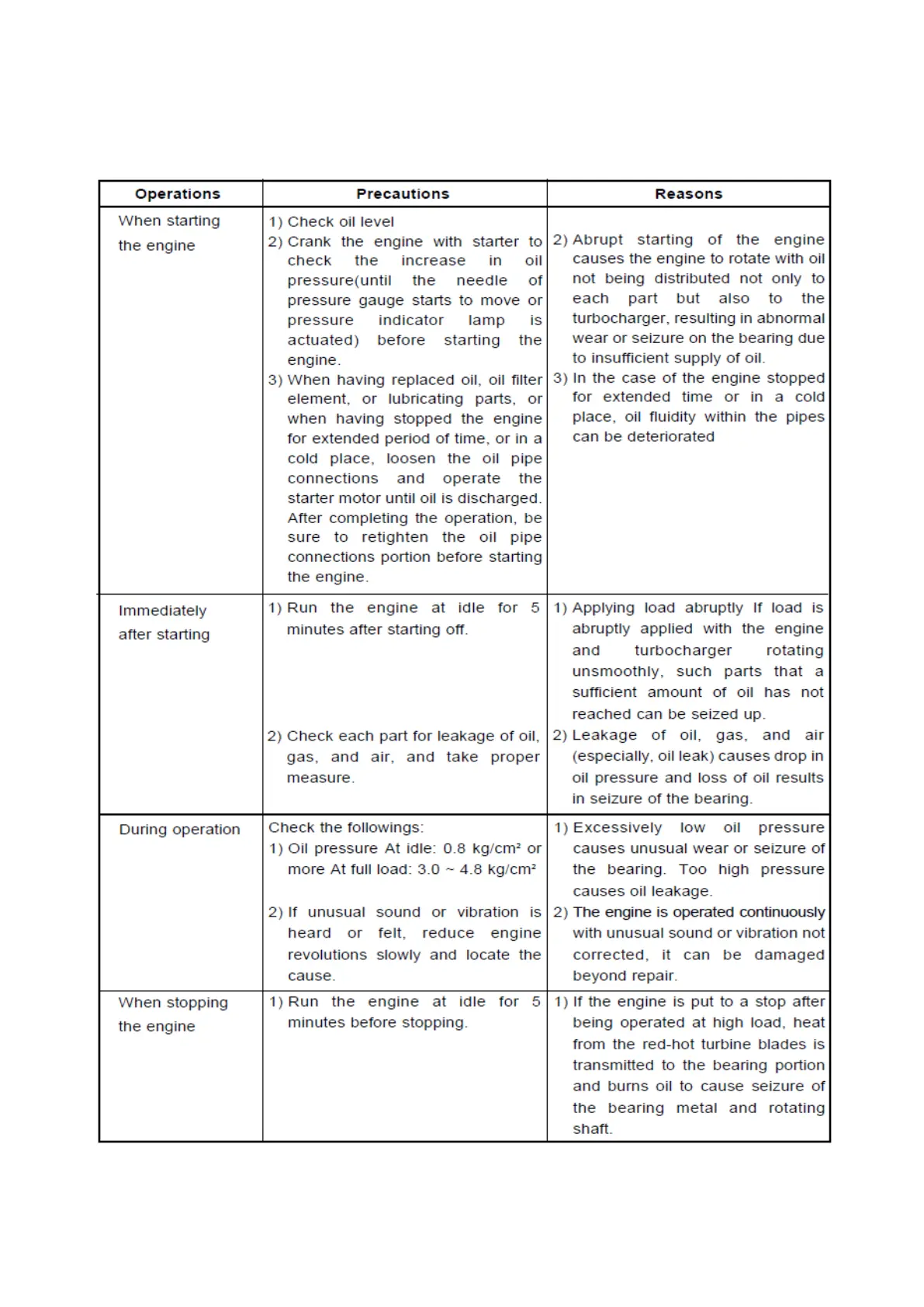 The following precautions should be observed when starting, operating, or stopping the engine: