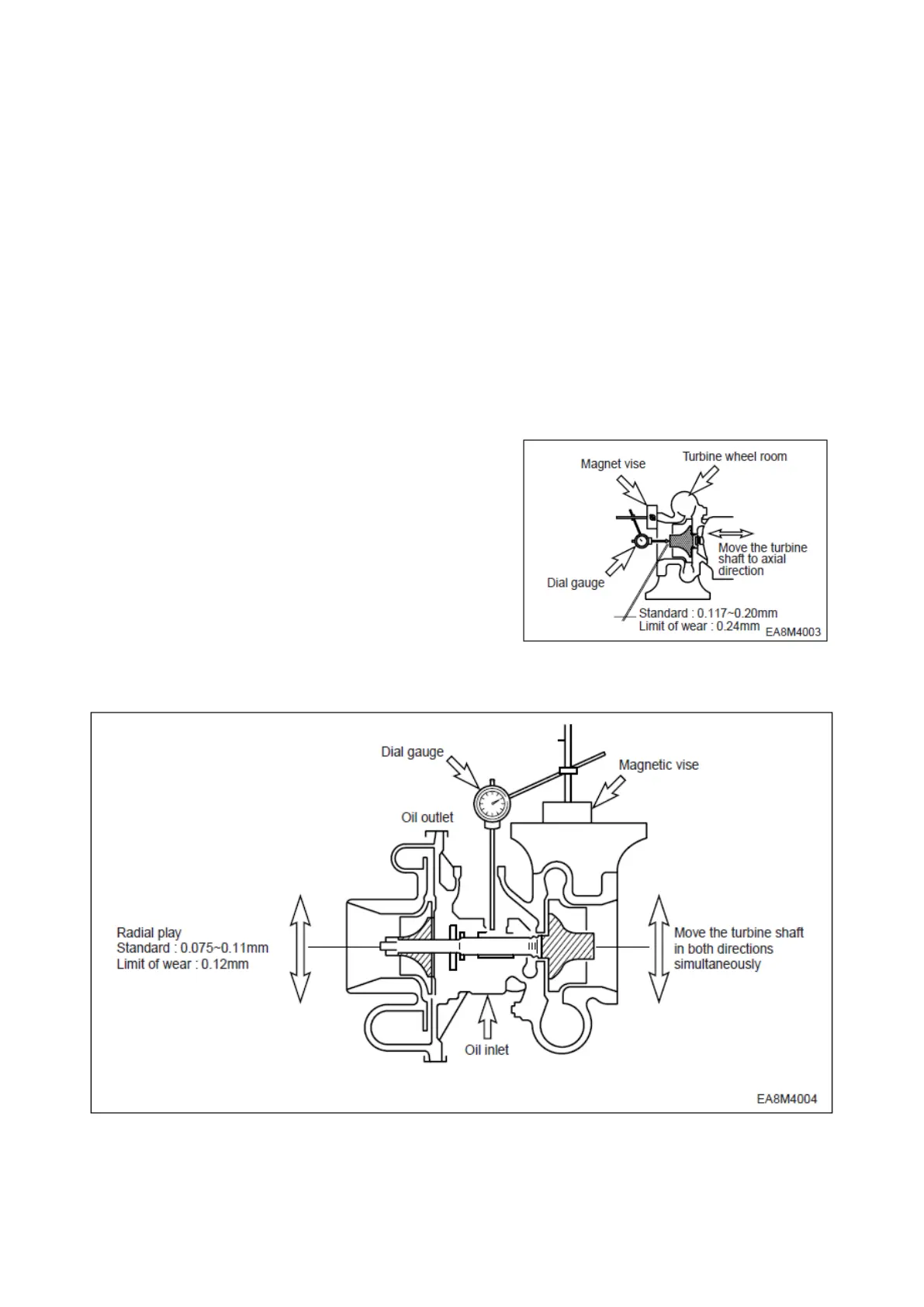 Disassemble the turbocharger from the engine, then check the rotor axial play and radial play.