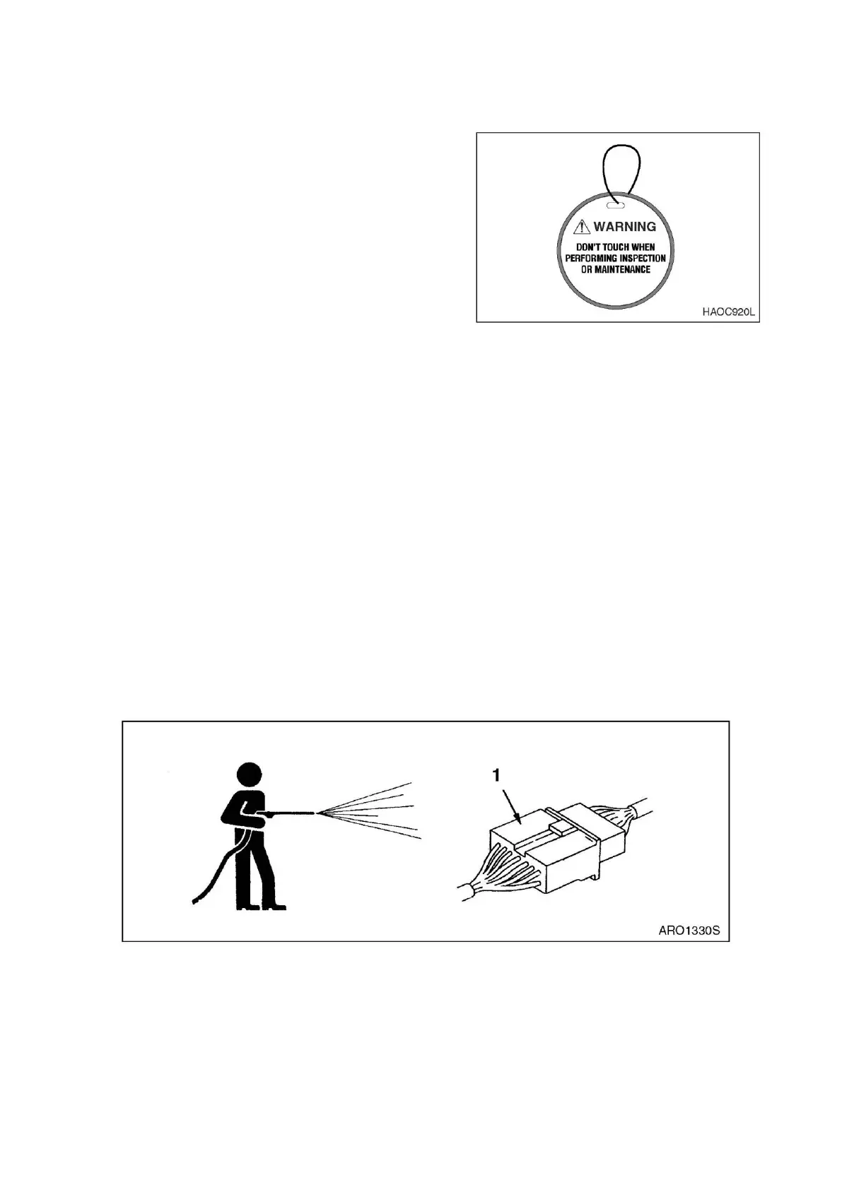 • Do not spray water directly on electrical components (sensors, connector) (1, Figure 23). If water gets