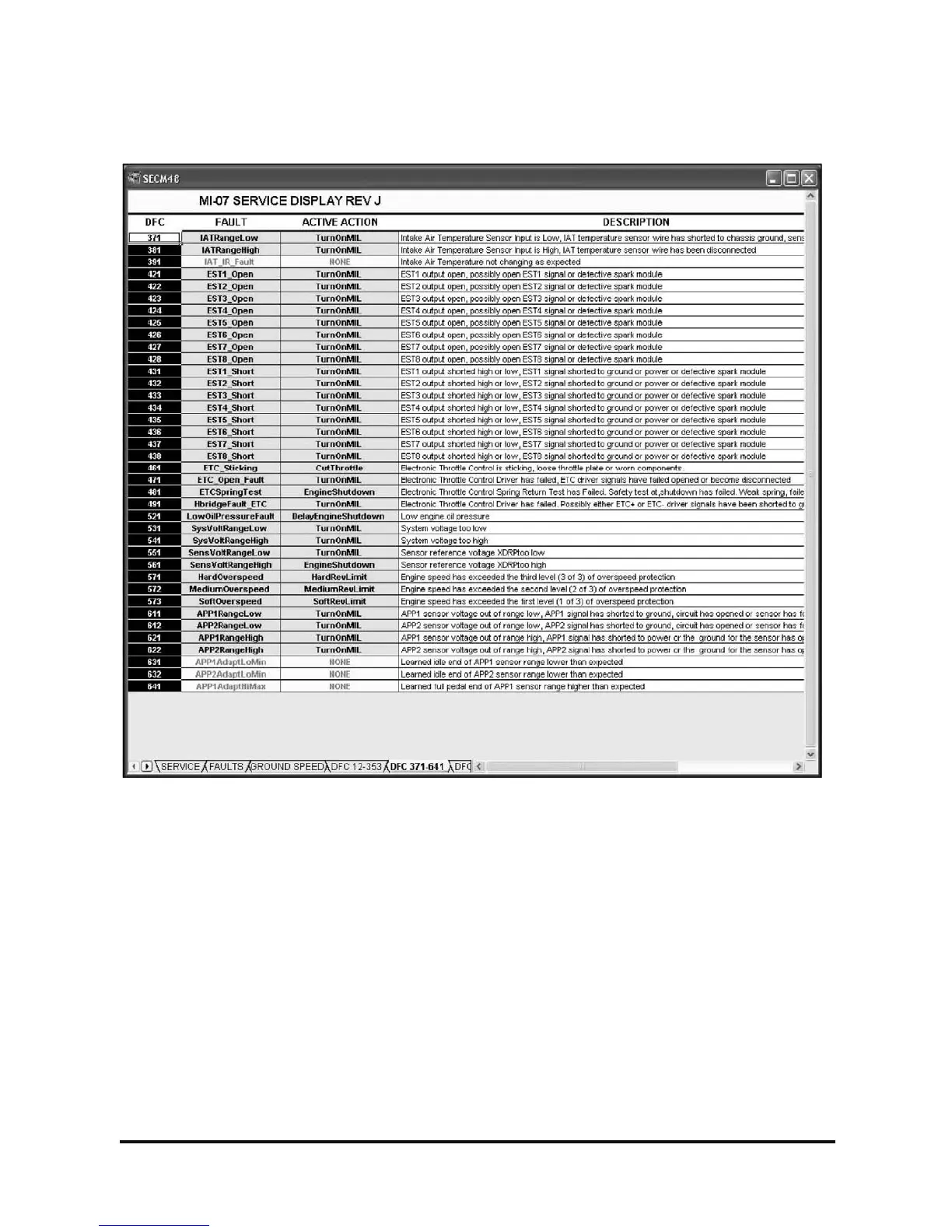 DFC (Diagnostic Fault Codes) 371 through 641 are defined on this display for quick reference. Faults that are