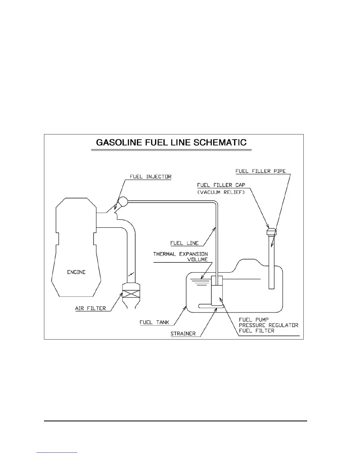 A gasoline fuel system includes the following components:
