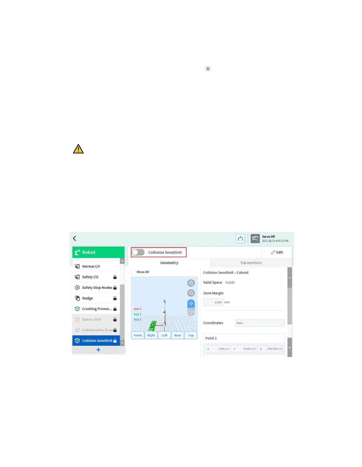 To set the Collision Sensitivity Reduction Zone, tap the Add button on the Robot Workcell and