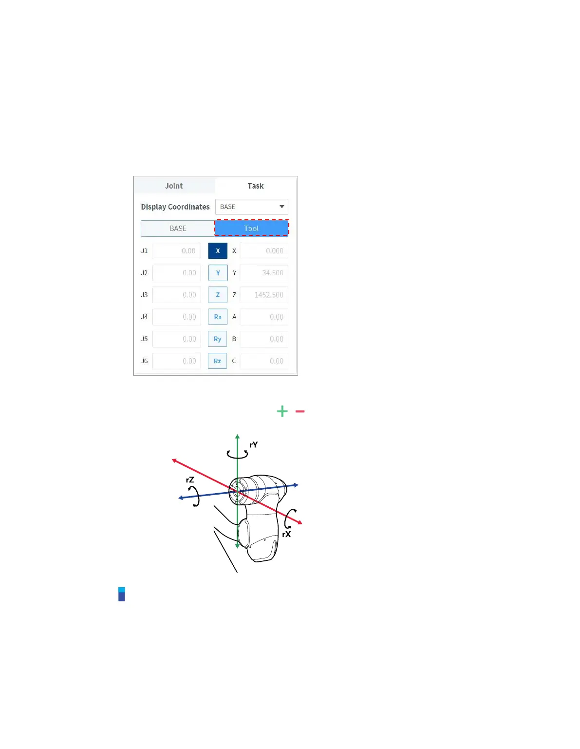 2 Select Base or World as the display coordinates and set the Tool based on the reference point of