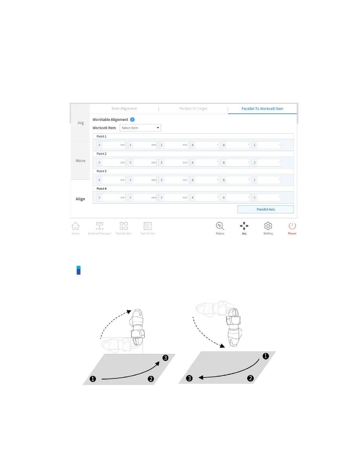 1 Select the Align screen and select the Parallel To Workcell Items tab.