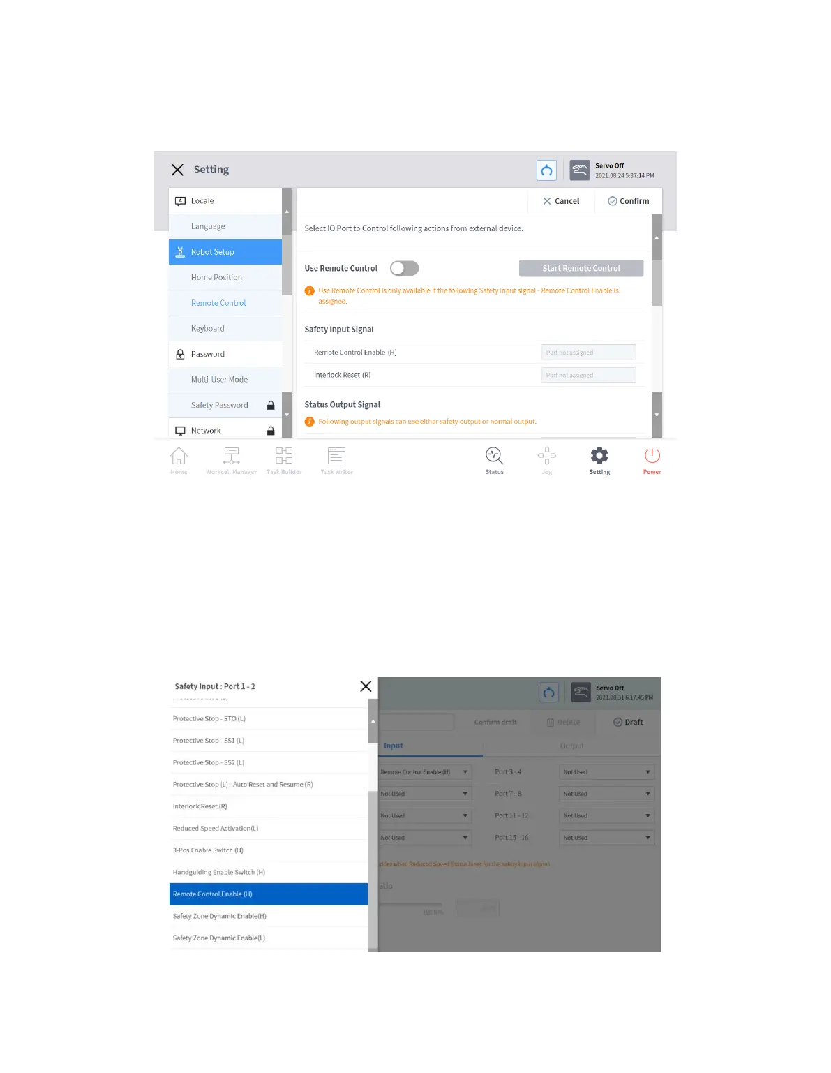 1 Select the Remote Control menu in the Setting > Robot Setup menu.