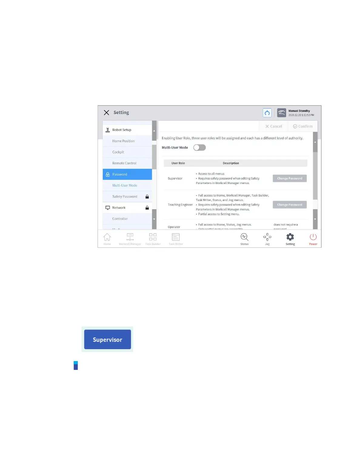 The User Role On/Off, description of user role and Change Password buttons appear in