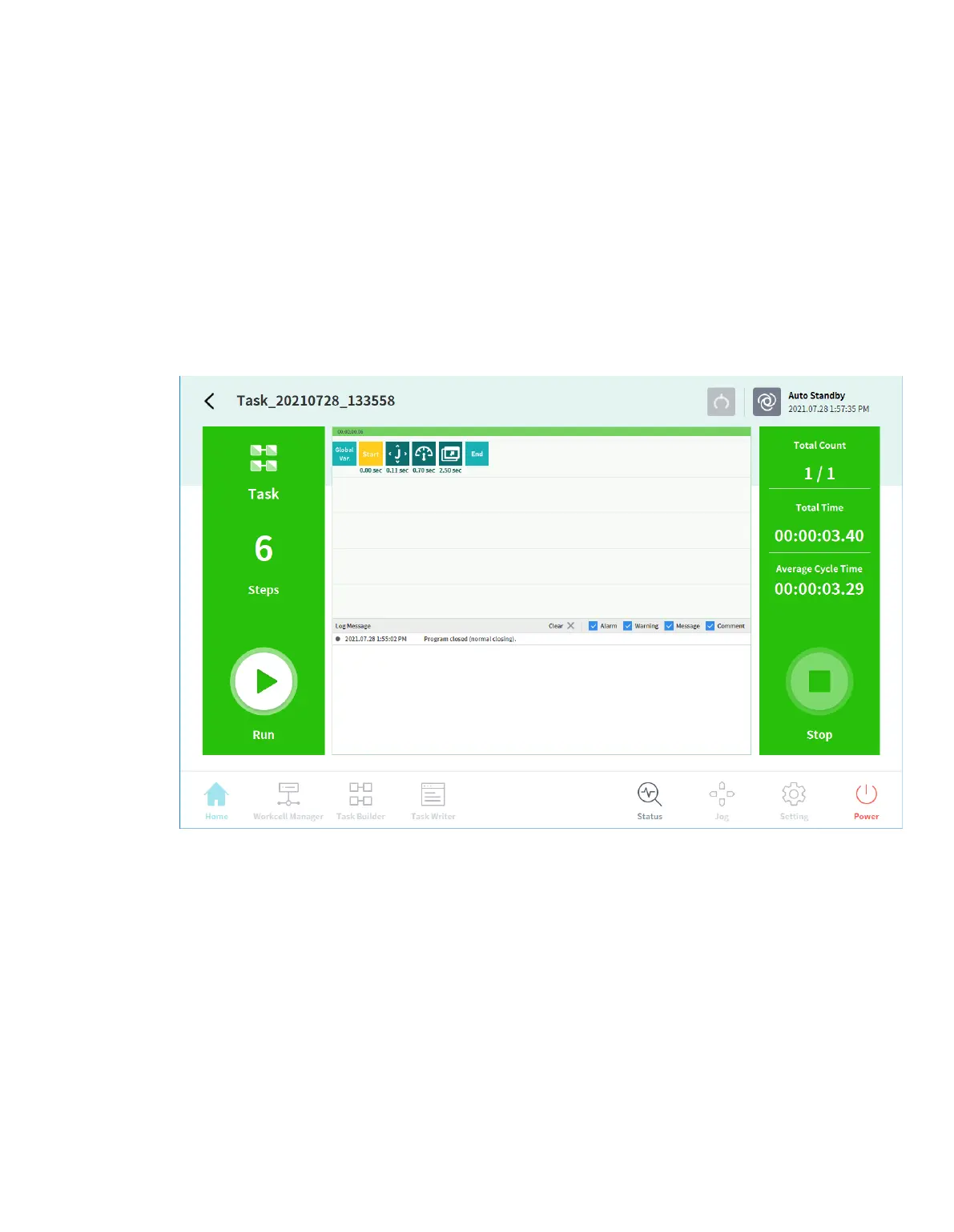 The Run screen under Home supports real-time logging. You can see logs of the Alarm, Warnin