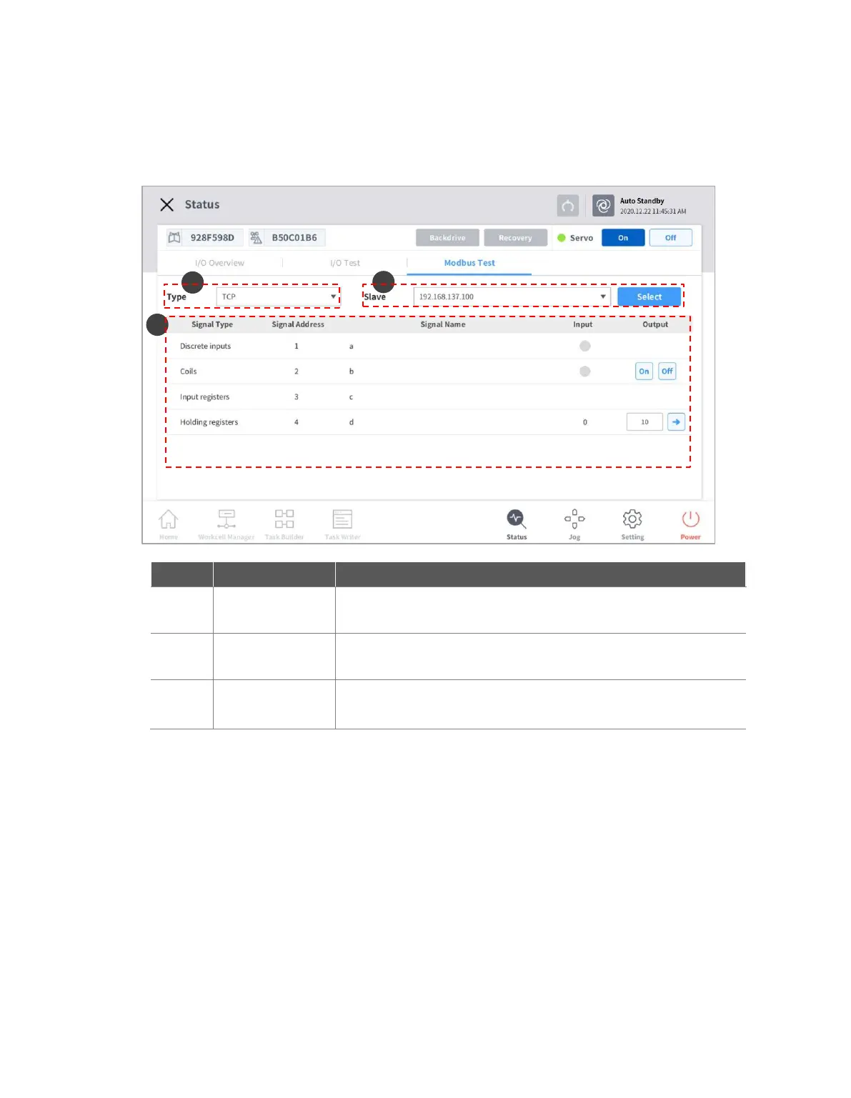 This is the menu to check and test Modbus signals set at Modbus TCP, Modbus RTU, and predefined Modbus.