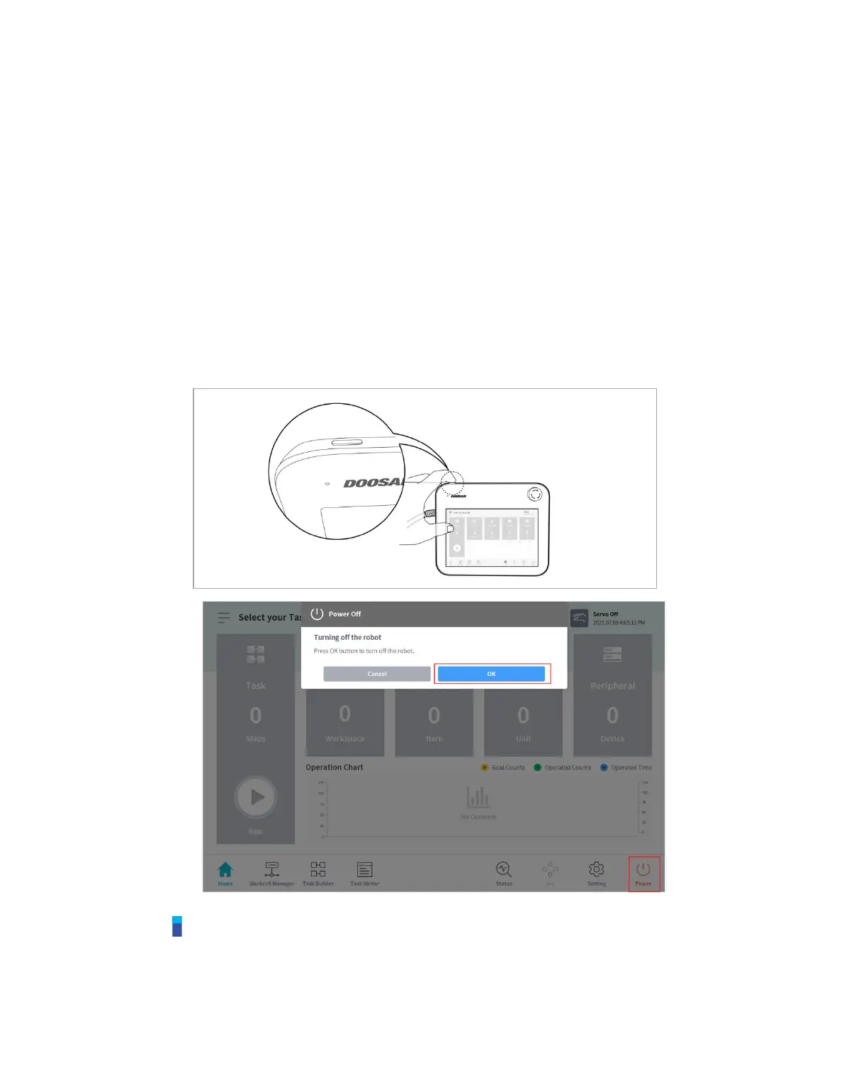 • Press the shutdown button on the teach pendant or press and hold the power button on the