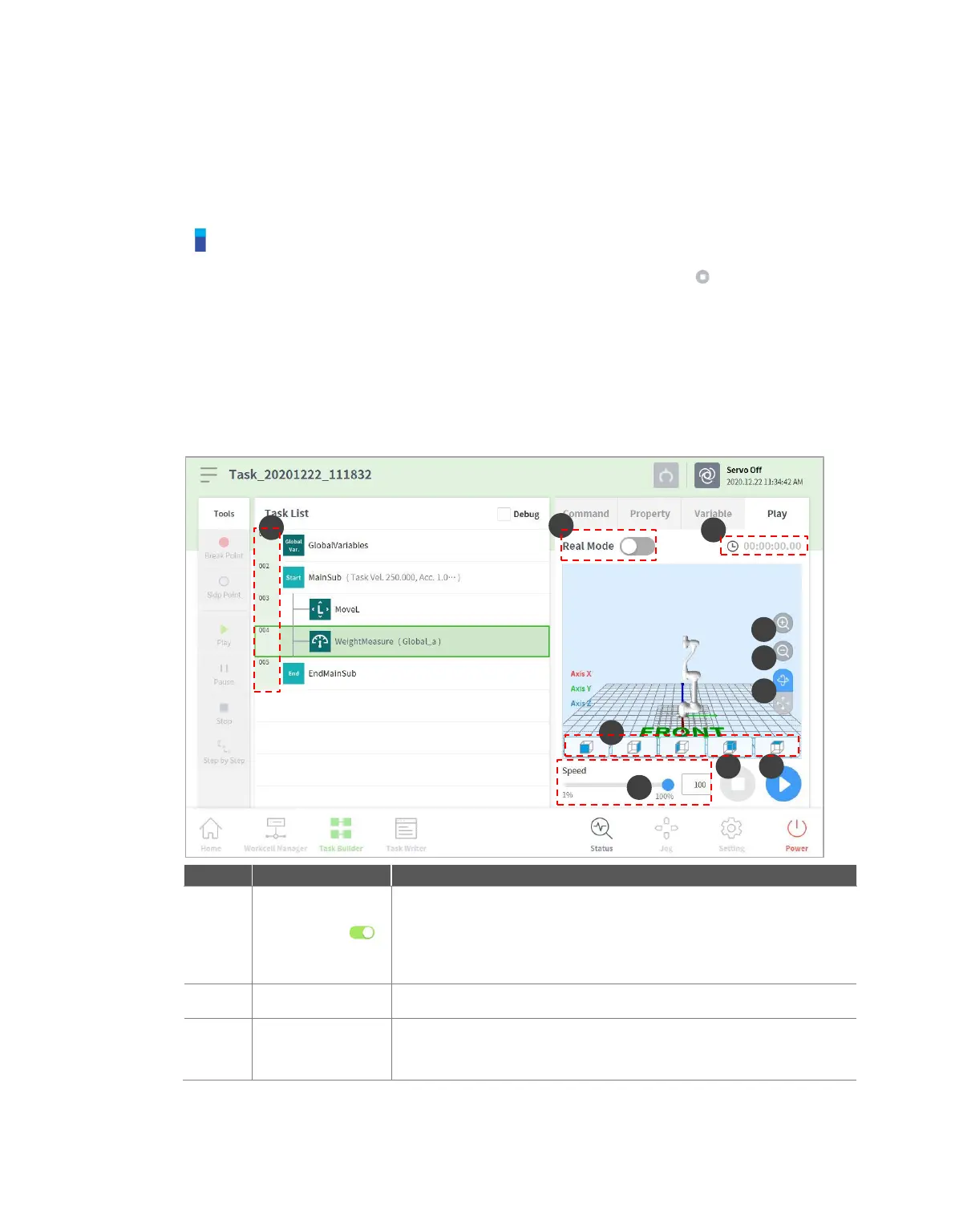 The virtual mode screen of Task Builder is structured as follows: