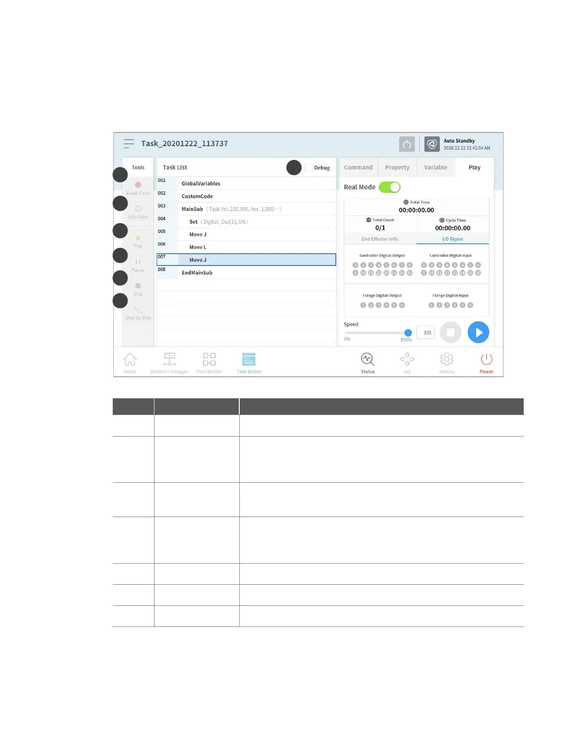 The debug mode of the Task Writer screen is structured as follows: