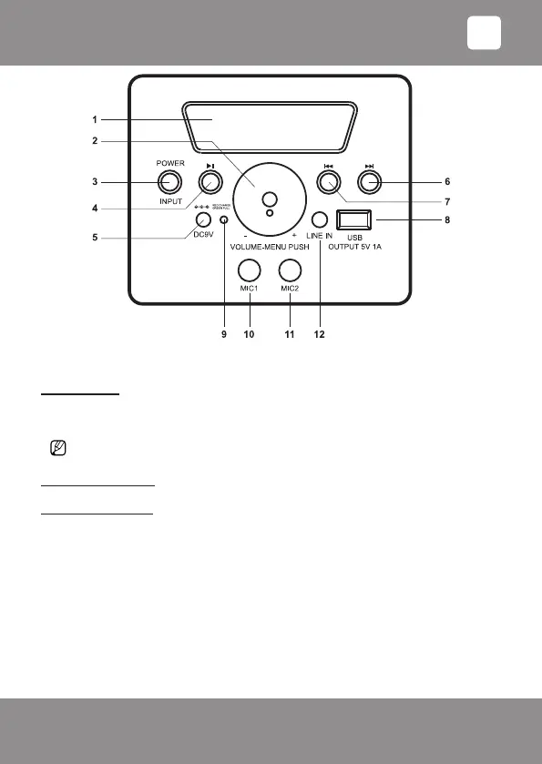 Komplekti kuuluva laadija kaabli pistik paigaldage helisüsteemi pesasse DC-9V (5), displeil