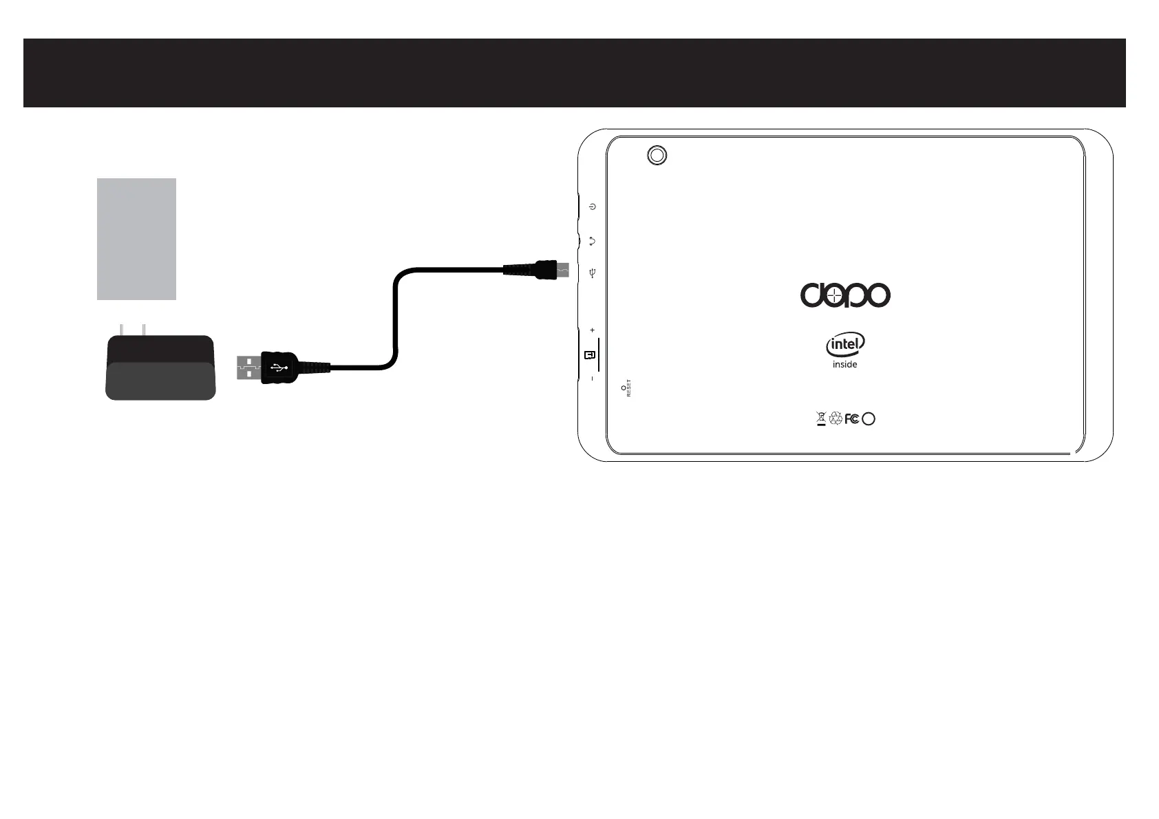 Connect the power adapter to a wall outlet, then to the Tablet as shown. It is recommended