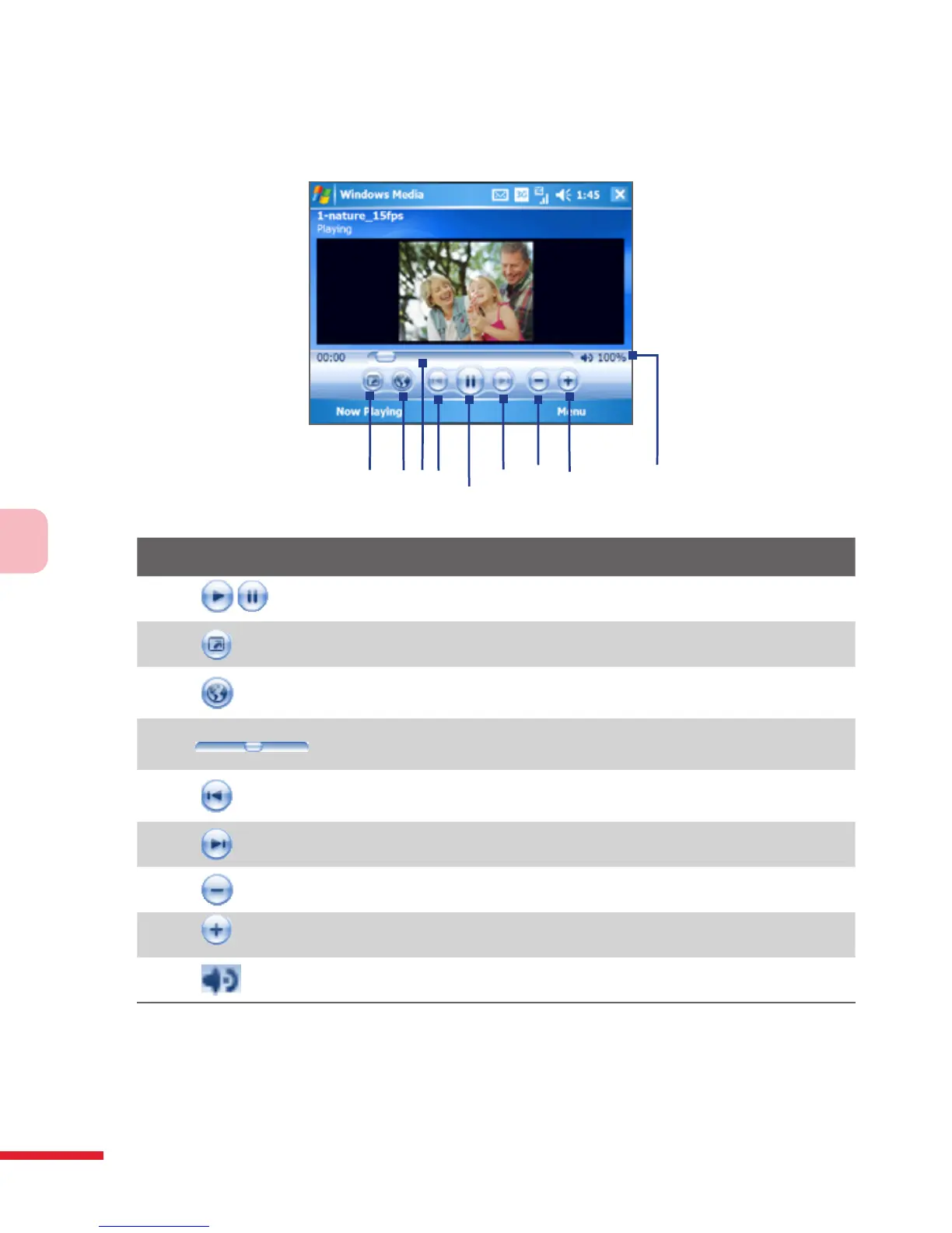 The following are available controls on the Windows Media Player Mobile.