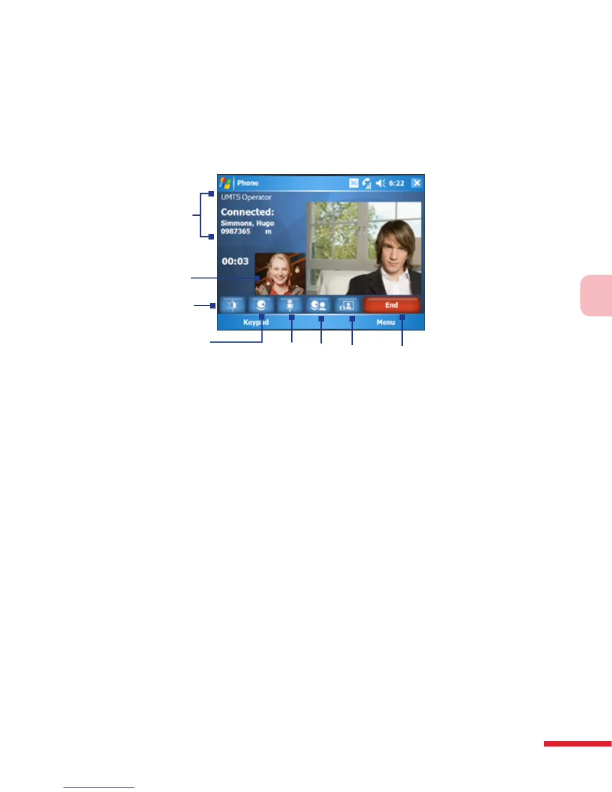 The following shows the Video Call screen and control buttons during an