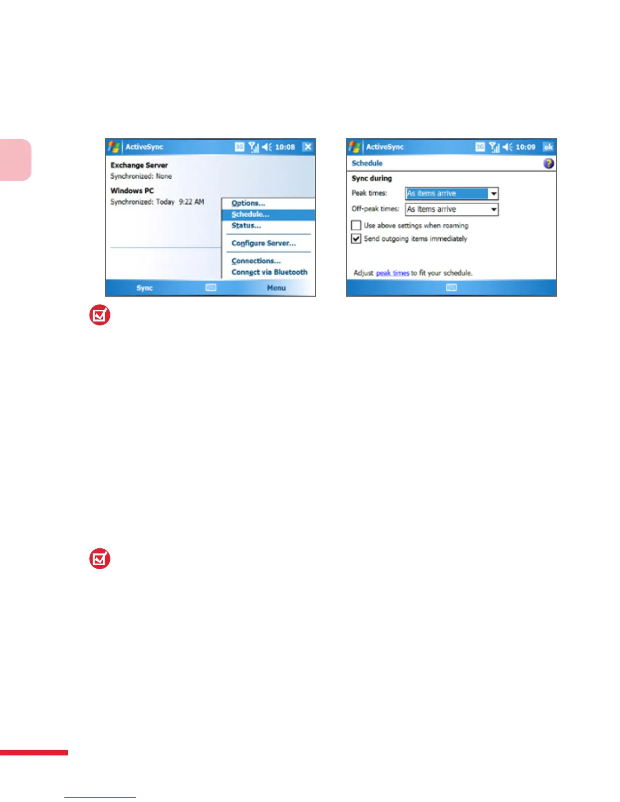 1. In ActiveSync on your device, tap Menu > Schedule.