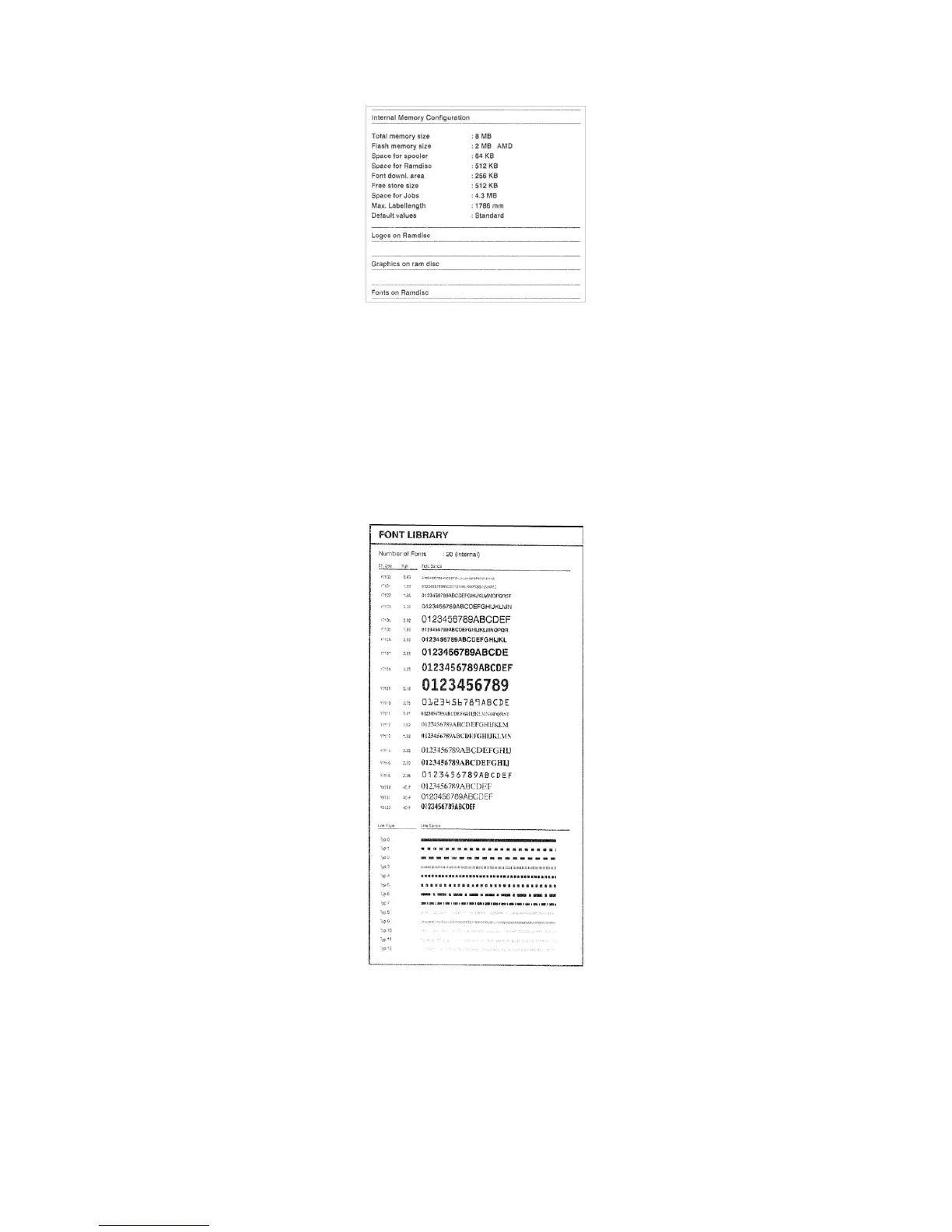 Print samples of all installed characters, bar codes and line samples (several pages).