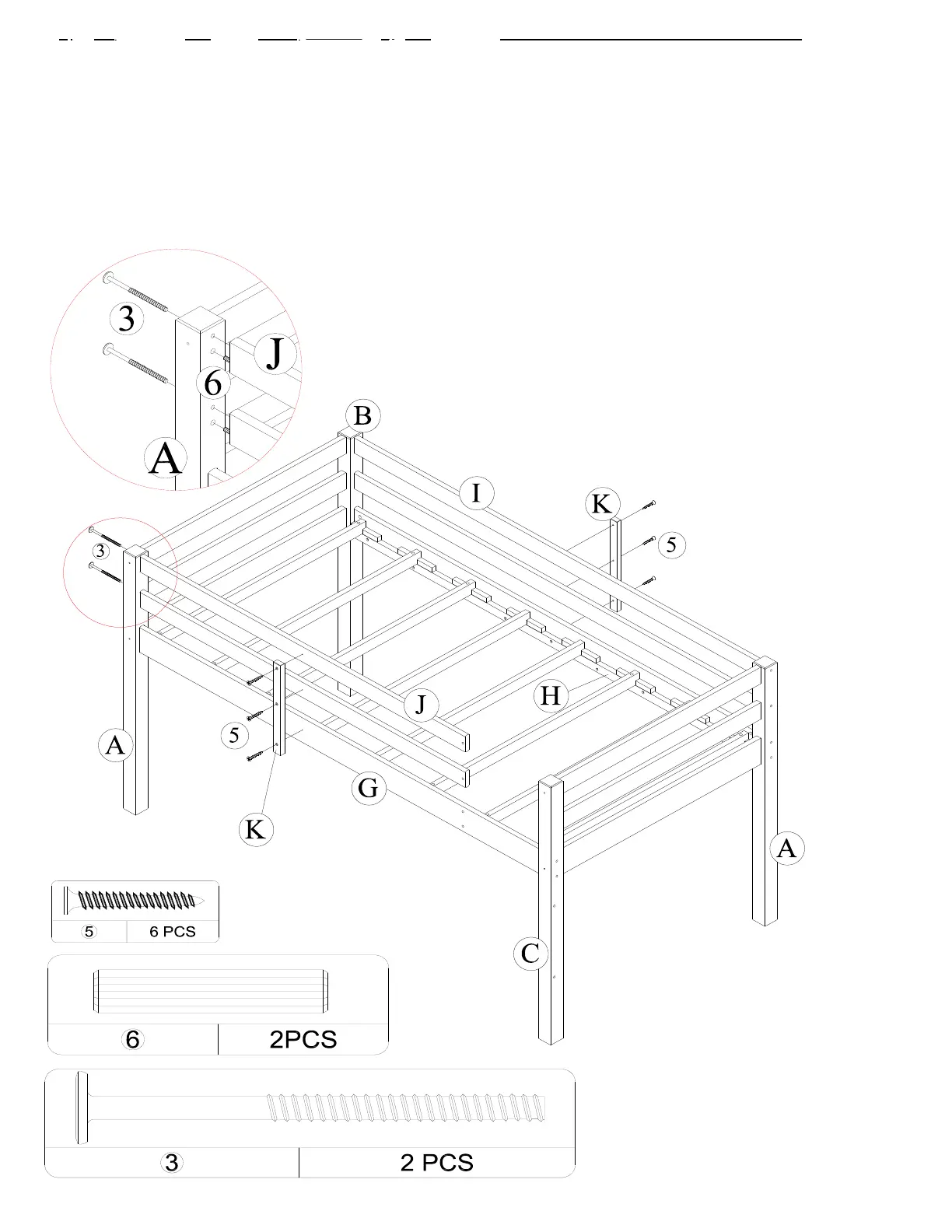 head wood screws (5). Attach the other guardrail leg (K) to the long guard rails (I) and side rail (H) with