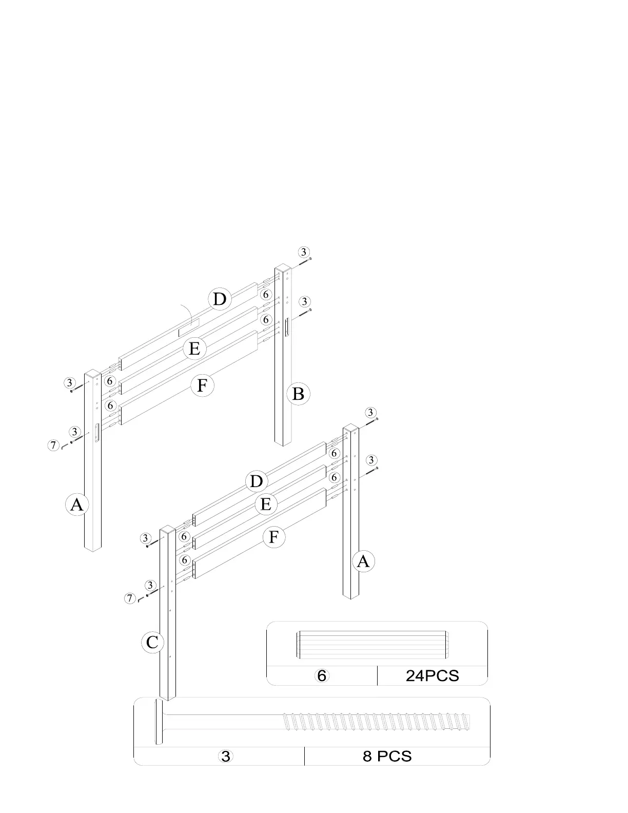 Fixez les traverses de tête de lit (D, F, E) aux poteaux (A) et (B) à l’aide des raccordements pour bois (3),