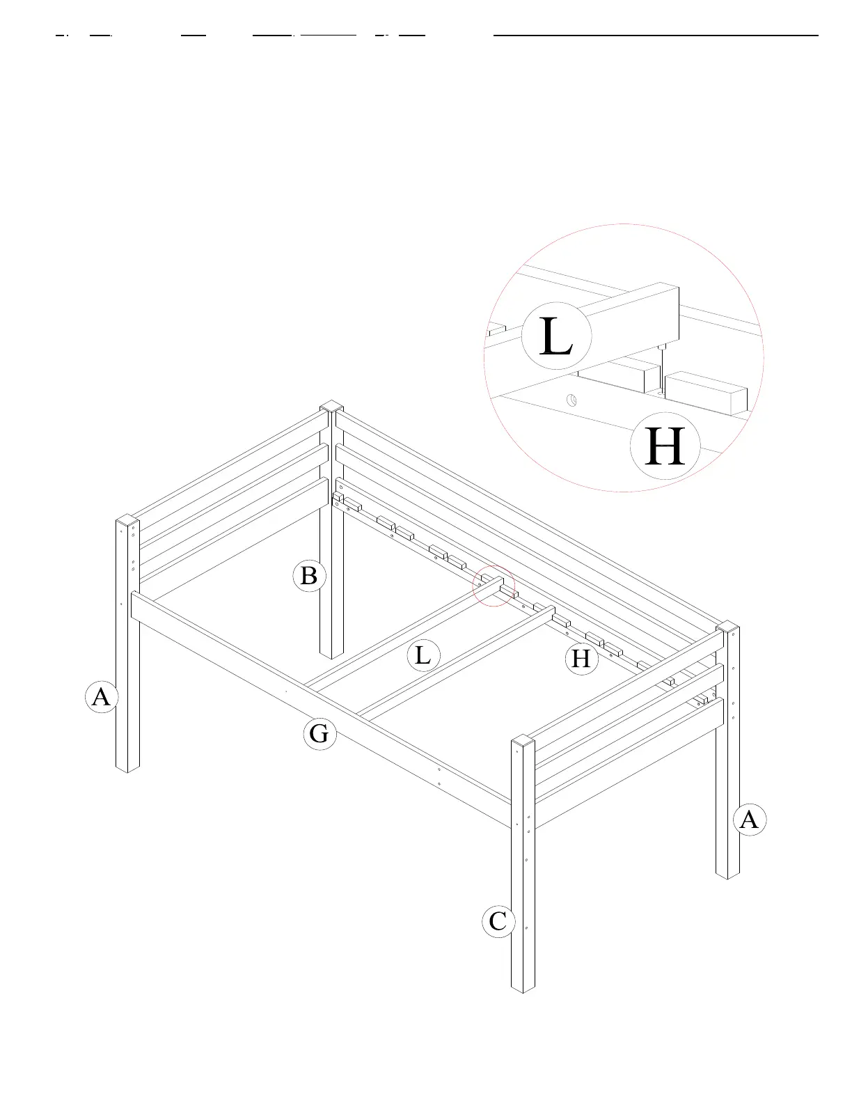 Insérez deux lattes (L) dans les fentes centrales des barres latérales (G) et (H), comme indiqué ci-