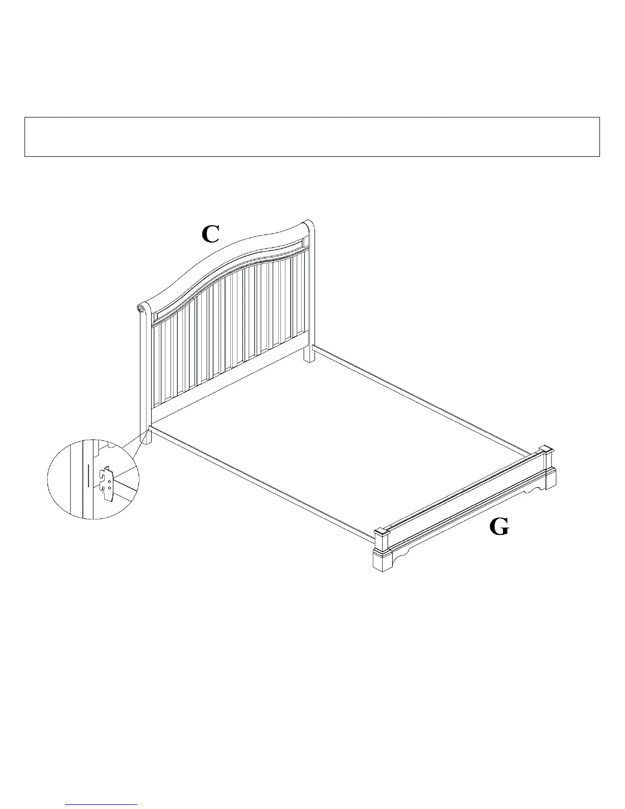 Attach standard size metal bedrails (not included) to headboard (C) and front rail (G) to