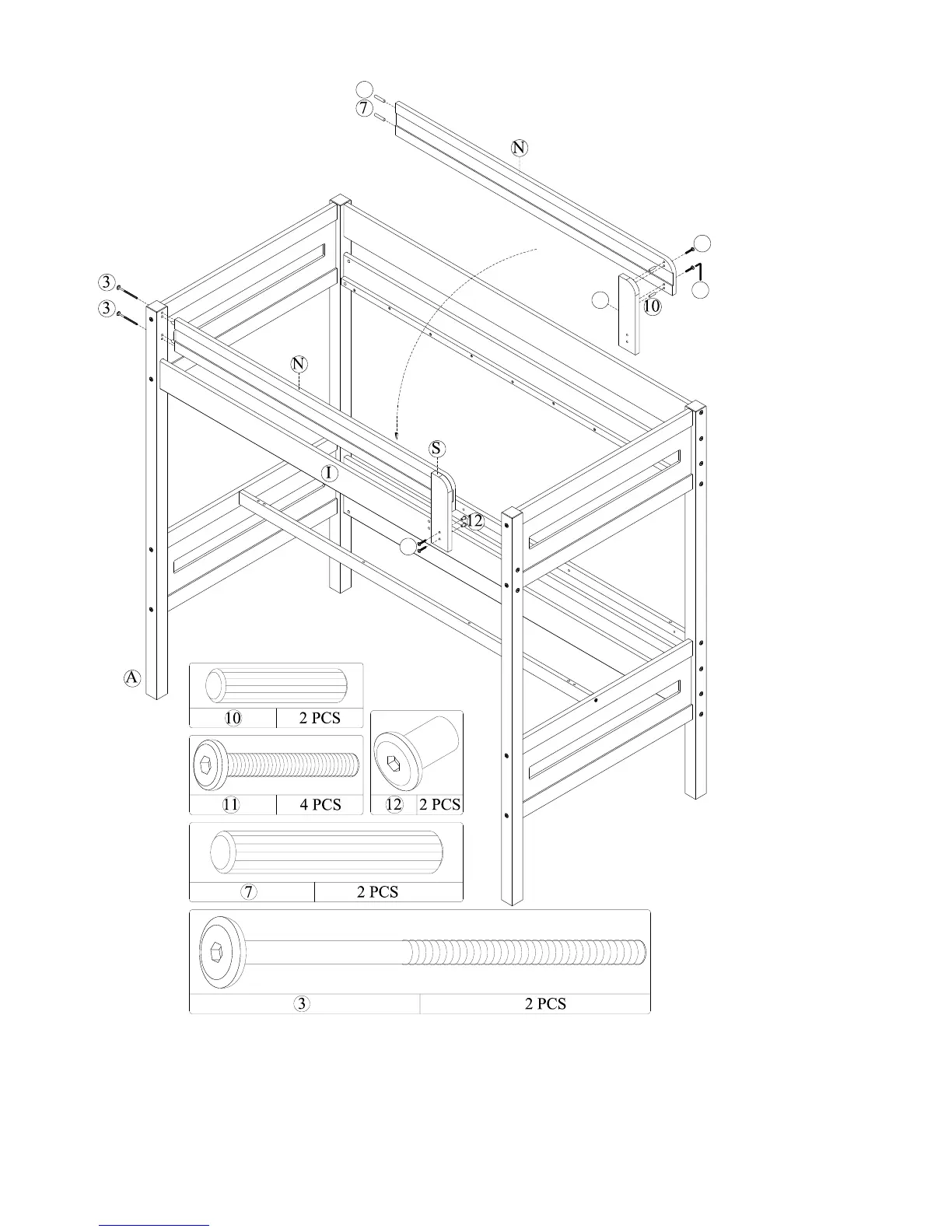 Attach the short guardrail post (S) to top front side rail (I) with joint connectors (11) and hex cap