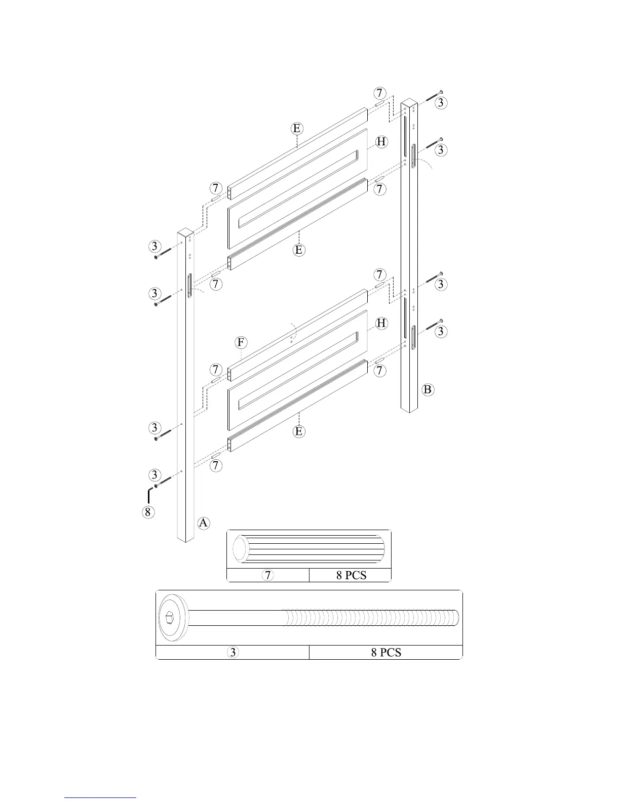 wood joint connectors (3) as shown. Use Allen key (8) to tighten the wood joint connectors (3).