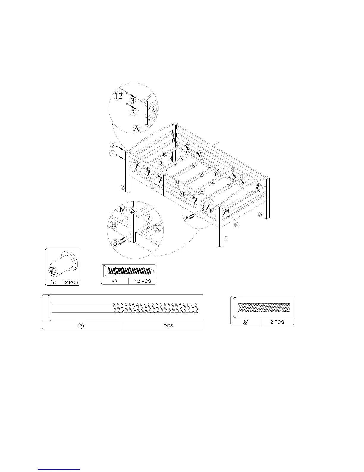slats (K) onto the top side rails (H & I) with flat head wood screws (4) and place the slats (Z) onto