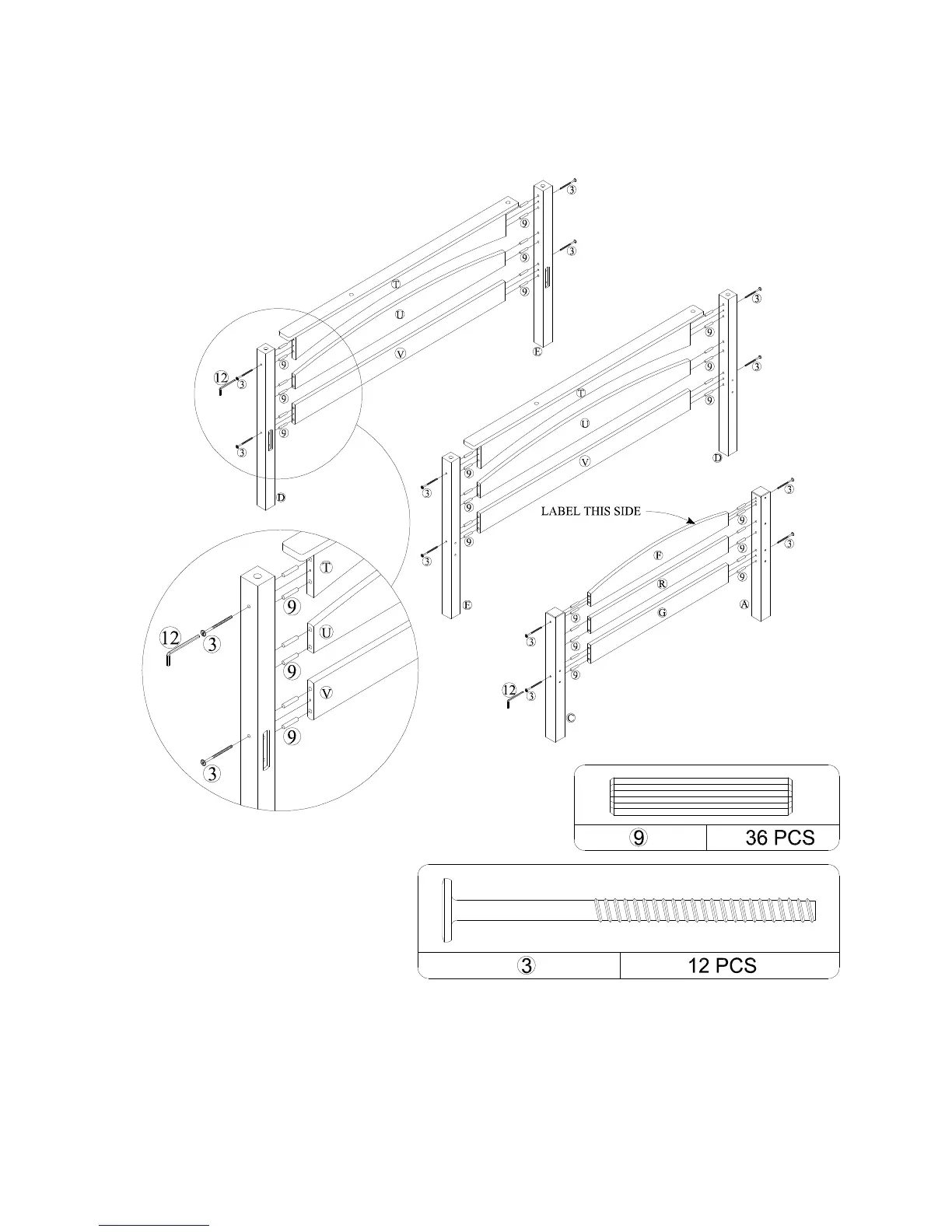 NOTE: Use headboard top cross (F) with the label attached to it between top posts (A) and (C). See