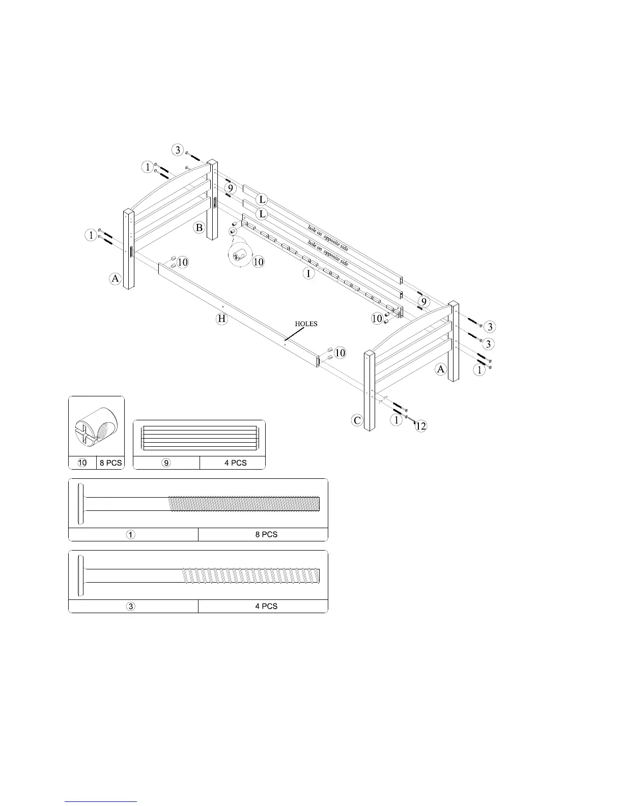 Insert barrel nuts (10) into top side rails (H & I).