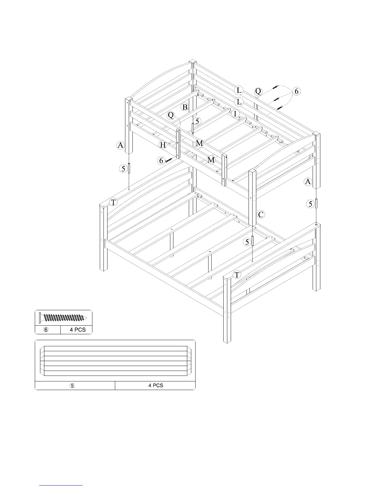 Place four wood dowels (5) into the holes in the bottom headboard top crosses (T). With the help of
