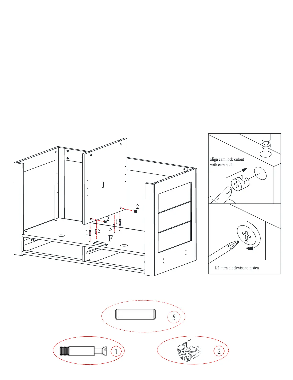 Attach vertical panel (J) to the middle panel (F) and secure by rotating cam locks (2) 1/2-turn