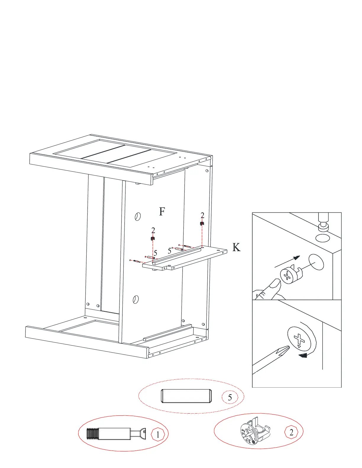 Inserte pernos de leva (1) y clavijas de madera (5) en el panel central (F).
