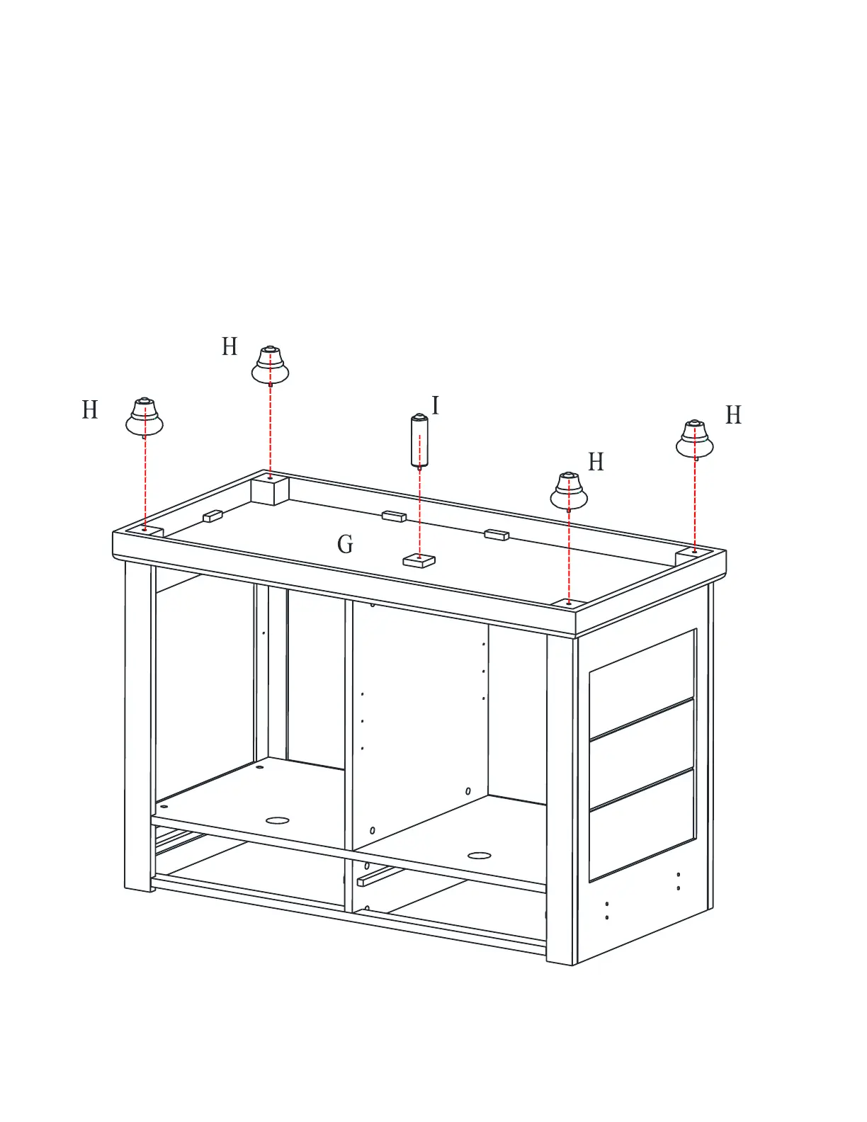 Coloque las patas cebolla (H) y la pata de soporte (I) en el panel inferior (G) girándolas en sentido horario.