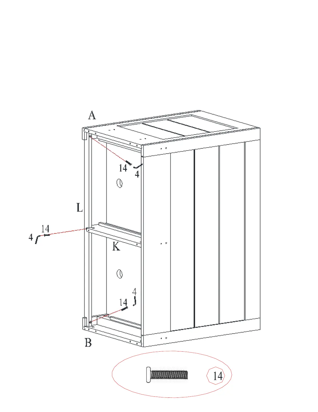 Attachez la barre supérieure avant (L) aux côtés gauche et droit (A et B) et au panneau supérieur (K)