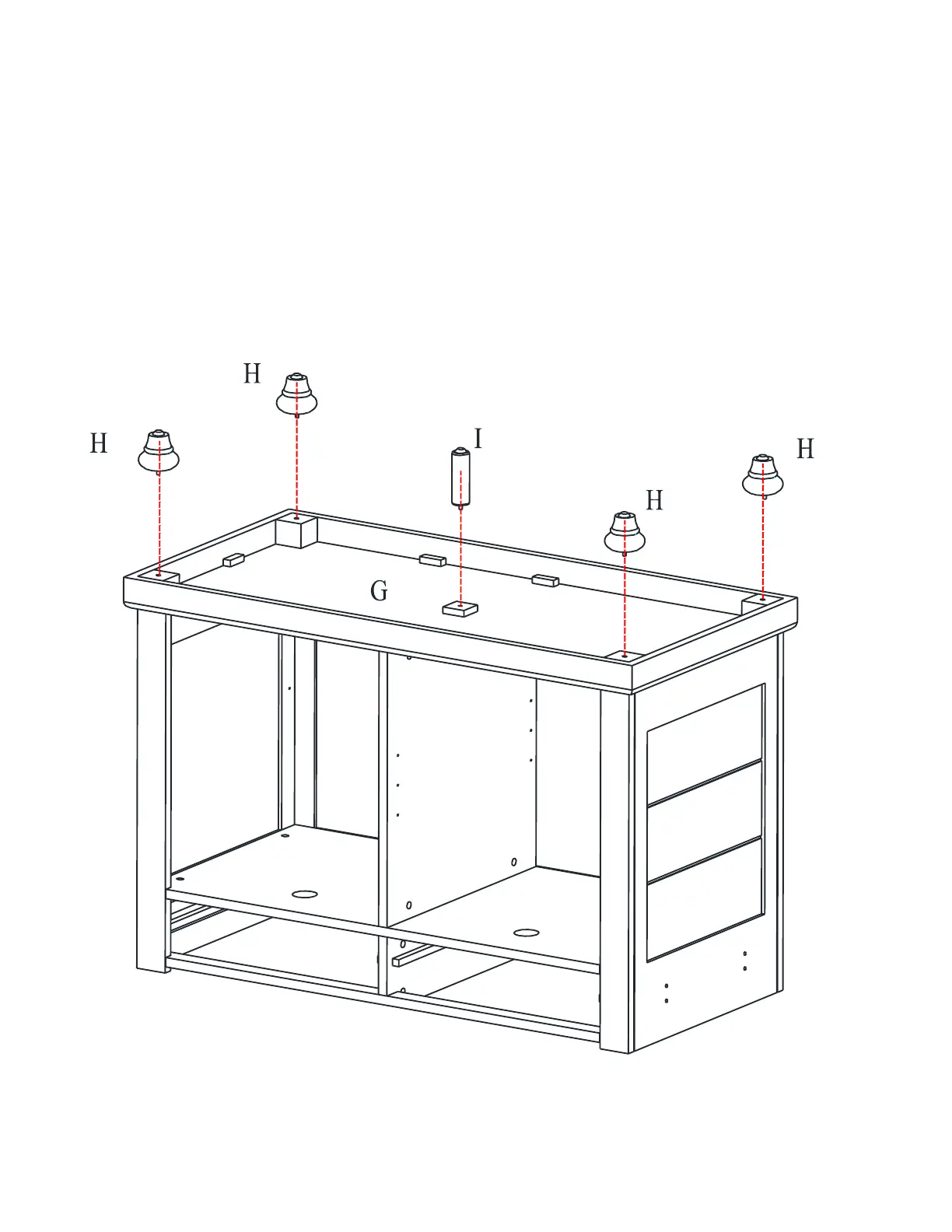 Installez les pieds en forme d’oignon (H) et le pied de support (I) dans le panneau inférieur (G) en