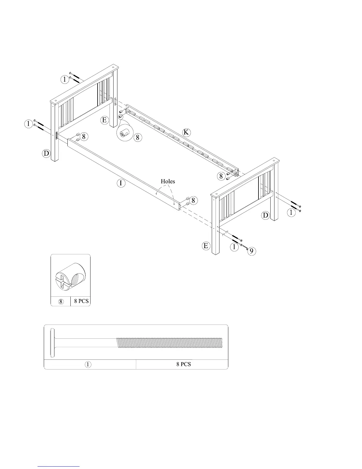 Attach the two headboards with bottom posts (D and E) to bottom side rails (I and K) using joint