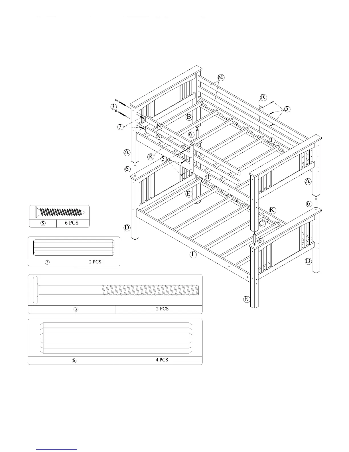 Attach another guardrail leg (R) (on the other side of the bed) to long guard rails (M) and top side rail (J)