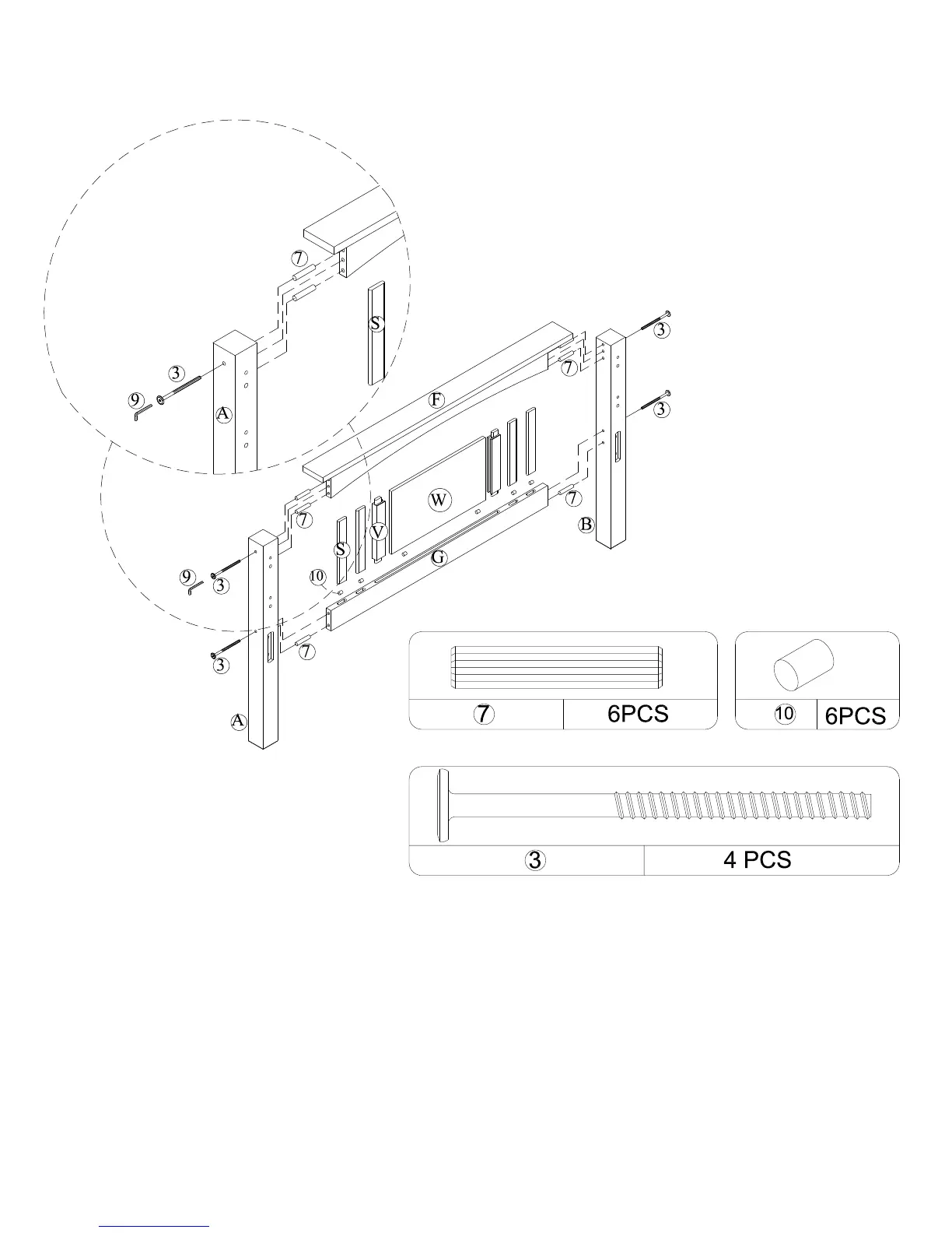 Attach the headboard top cross (F) on the top headboard slats (S & V) and headboard panel (W).