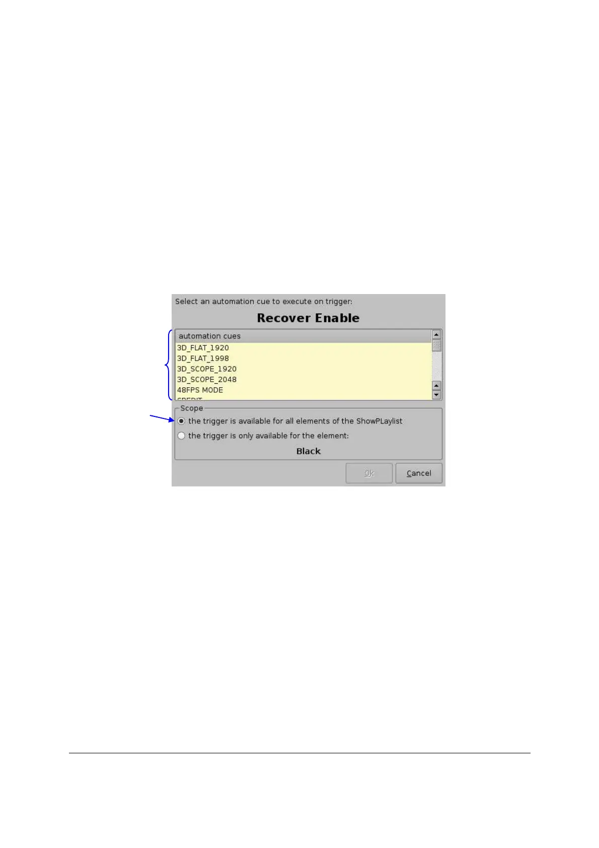 Trigger Cue est “all elements of the Show Playlist”, vous avez juste besoin de presser “OK”.