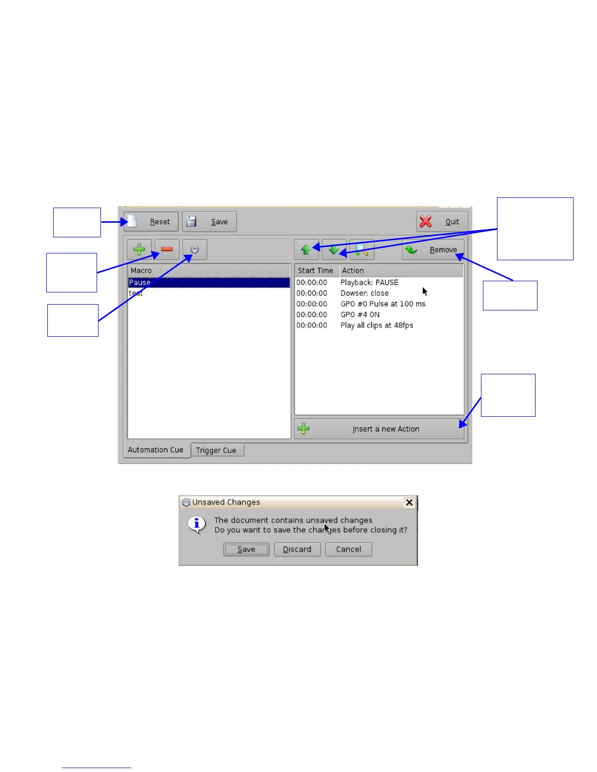 • To remove (delete) a Macro Automation Cue, select it in the Macro Editor window and click