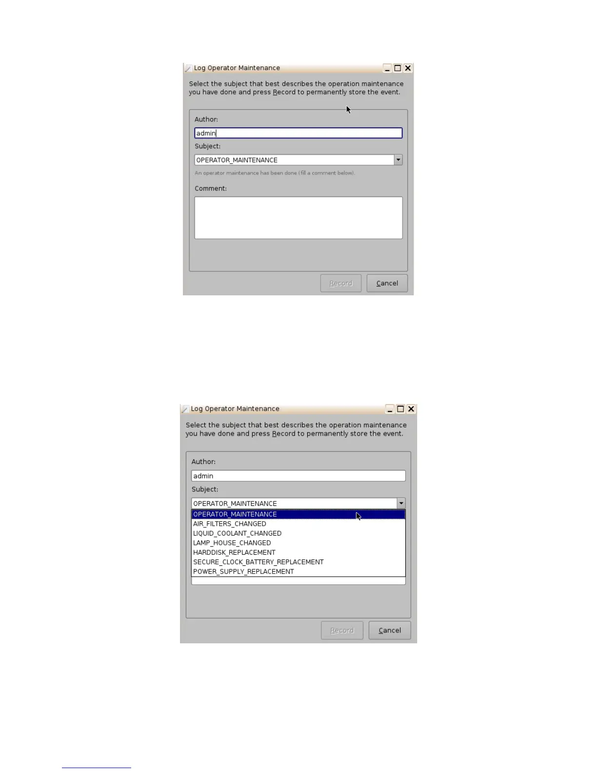• Select a subject from the drop-down "Subject" window. The maintenance technician can