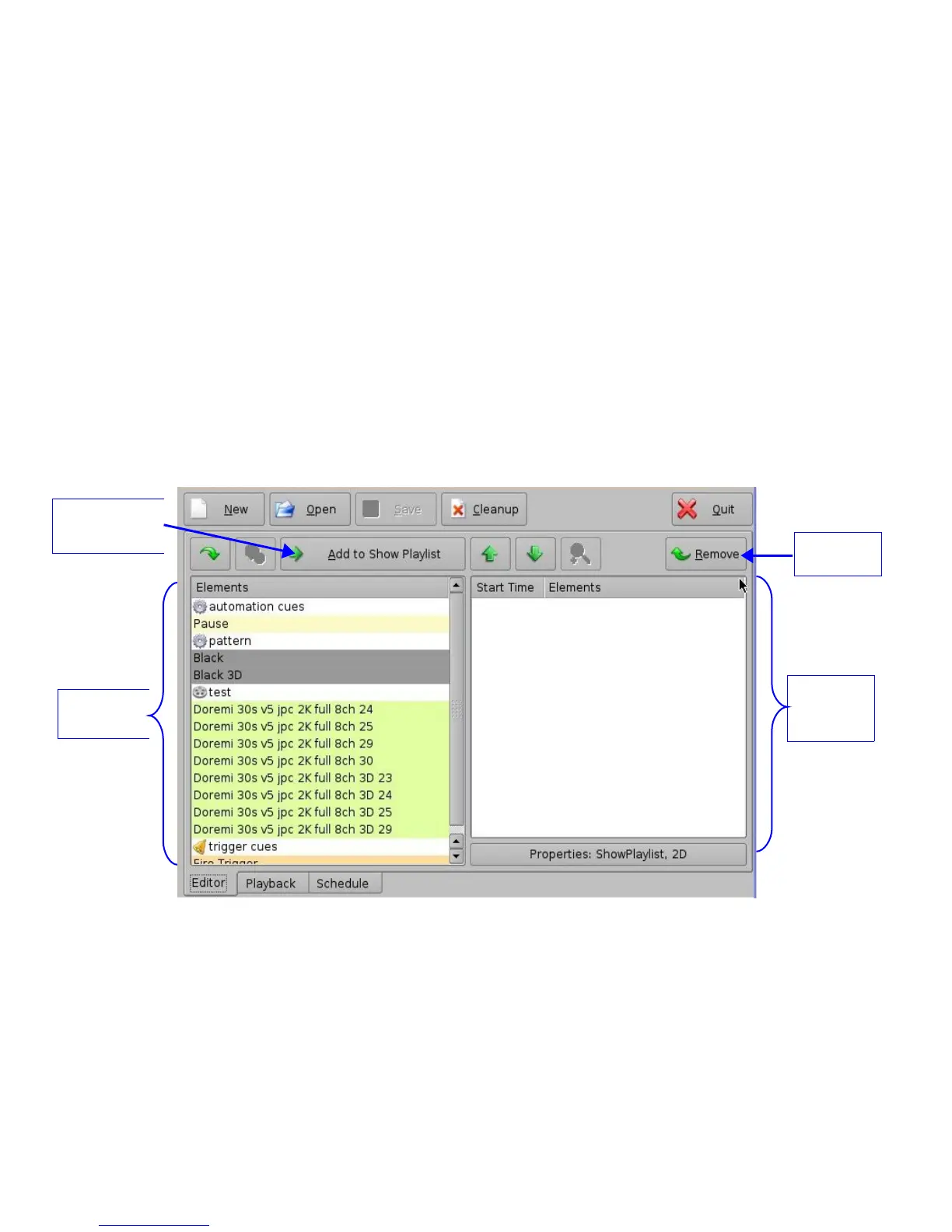 • To remove an element in a Show Playlist, select it in the Show Playlist window and click the