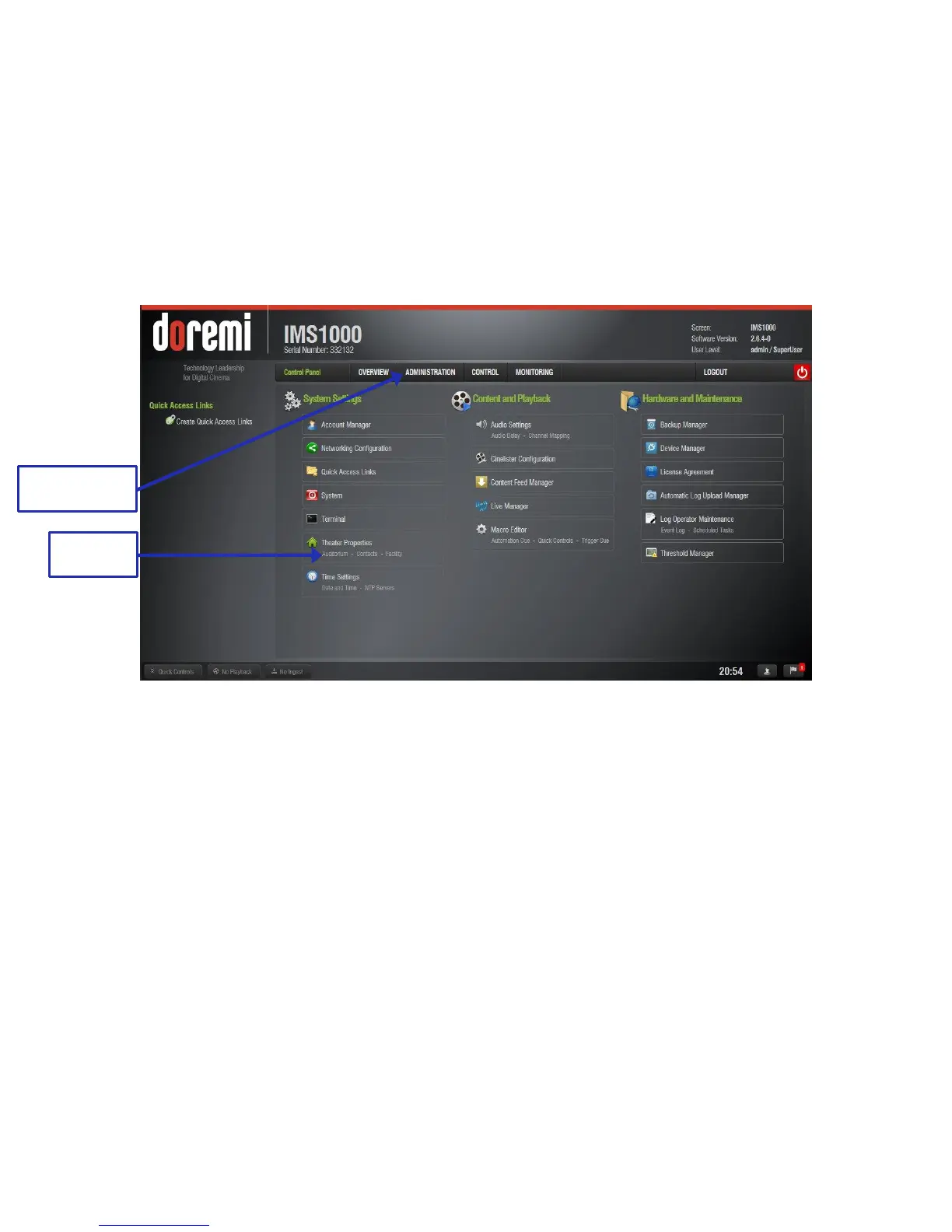The IMS1000 GUI Administration tab provides access to various applications as listed below.