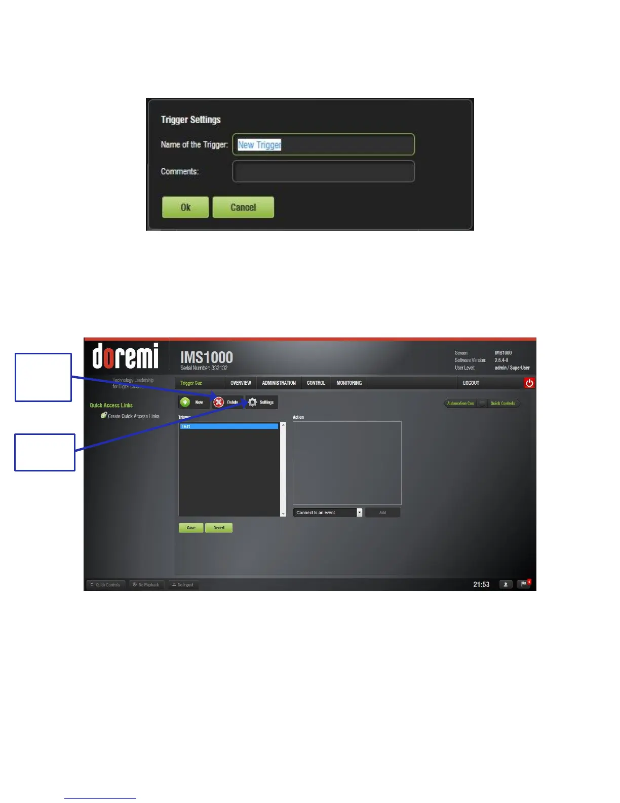● The newly created Trigger Cue will appear in the Trigger window and it will be ready to