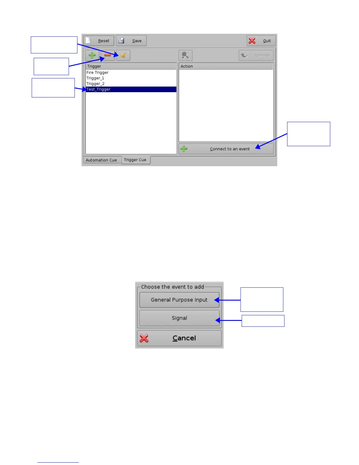 • To remove a Trigger Cue select it in the “Trigger” window and click the “Delete” button