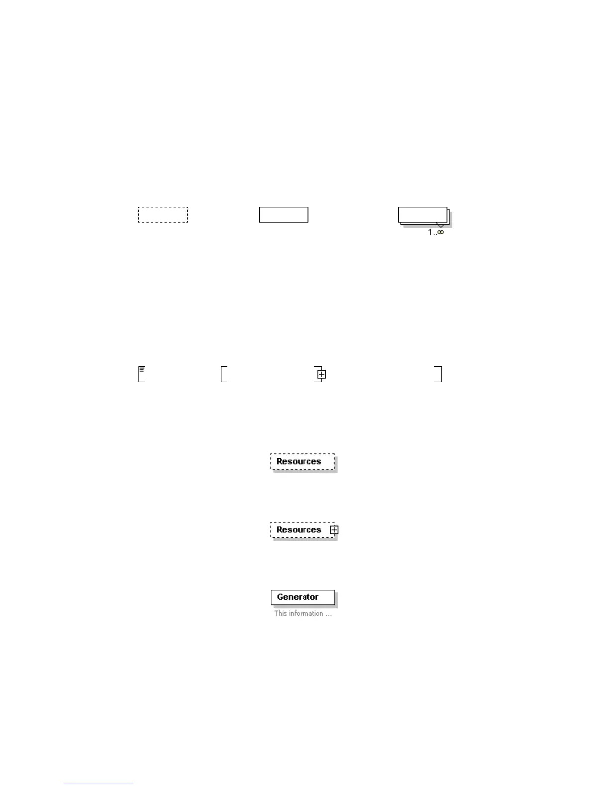 are drawn. Attributes are not visible. The cardinality of the element (0..1, 1 exactly, 0..n,