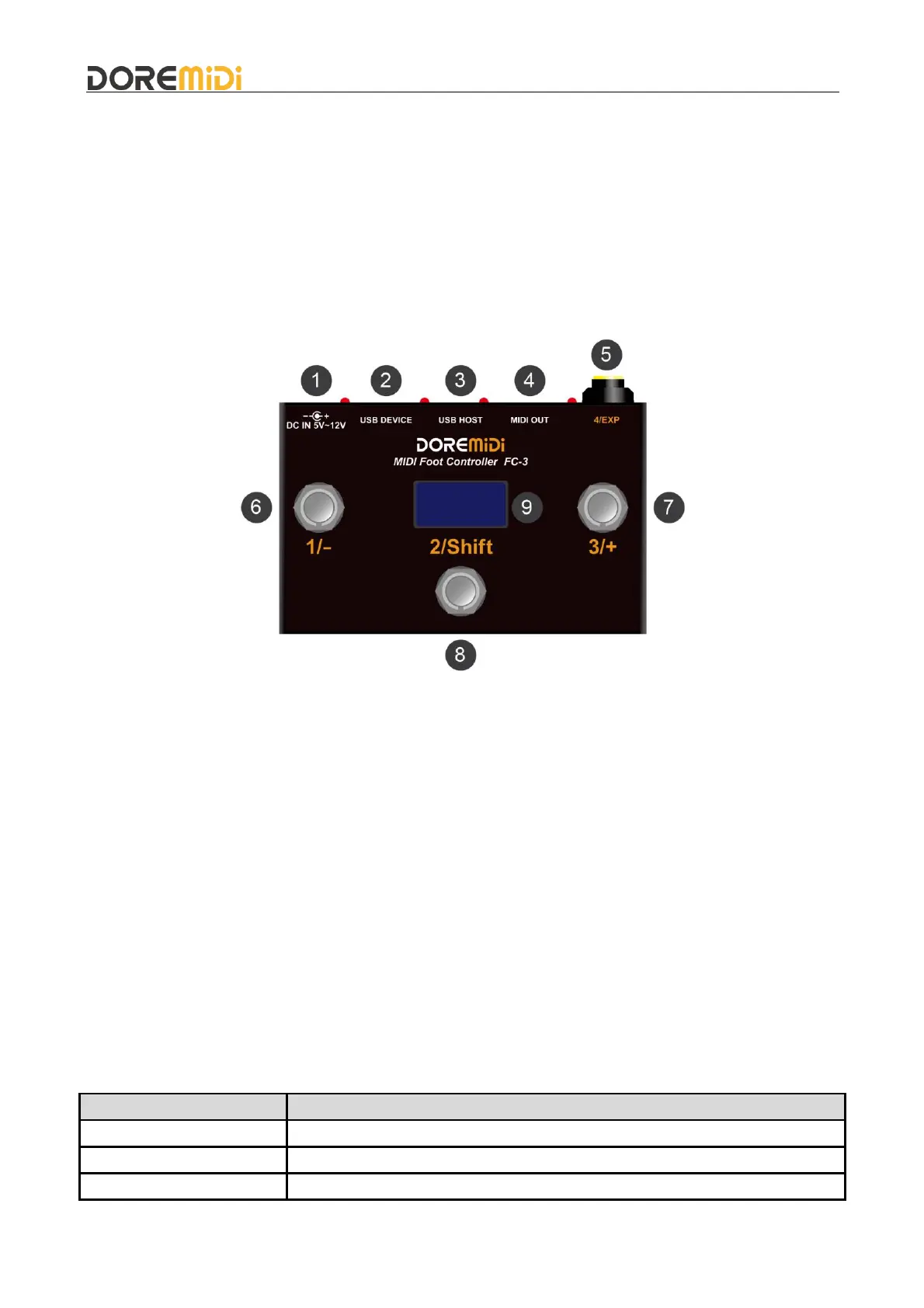 ❻❼❽1/-, 2/Shift, 3/+: Pedal Number: 1~3, Switch Pedal, output MIDI messages by